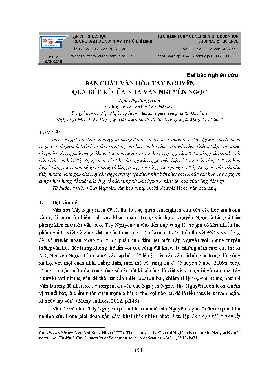 Bản chất văn hóa Tây Nguyên qua bút kí của nhà văn Nguyên Ngọc = The nature of the central highlands culture in nguyen ngoc’s notes