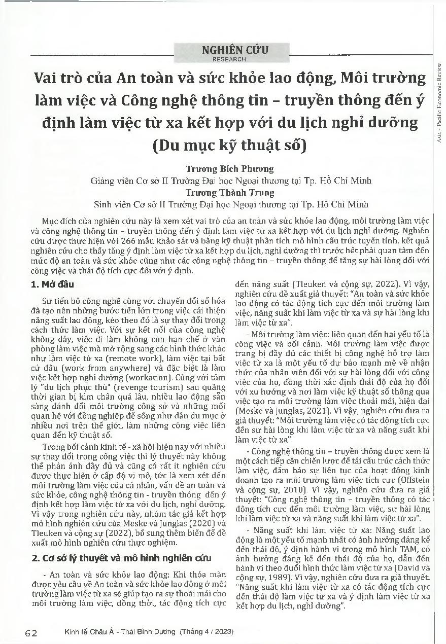 Vai trò của An toàn và sức khỏe lao động, Môi trường làm việc và Công nghệ thông tin - truyền thông đến ý định làm việc từ xa kết hợp với du lịch nghỉ dưỡng (Du mục kỹ thuật số)