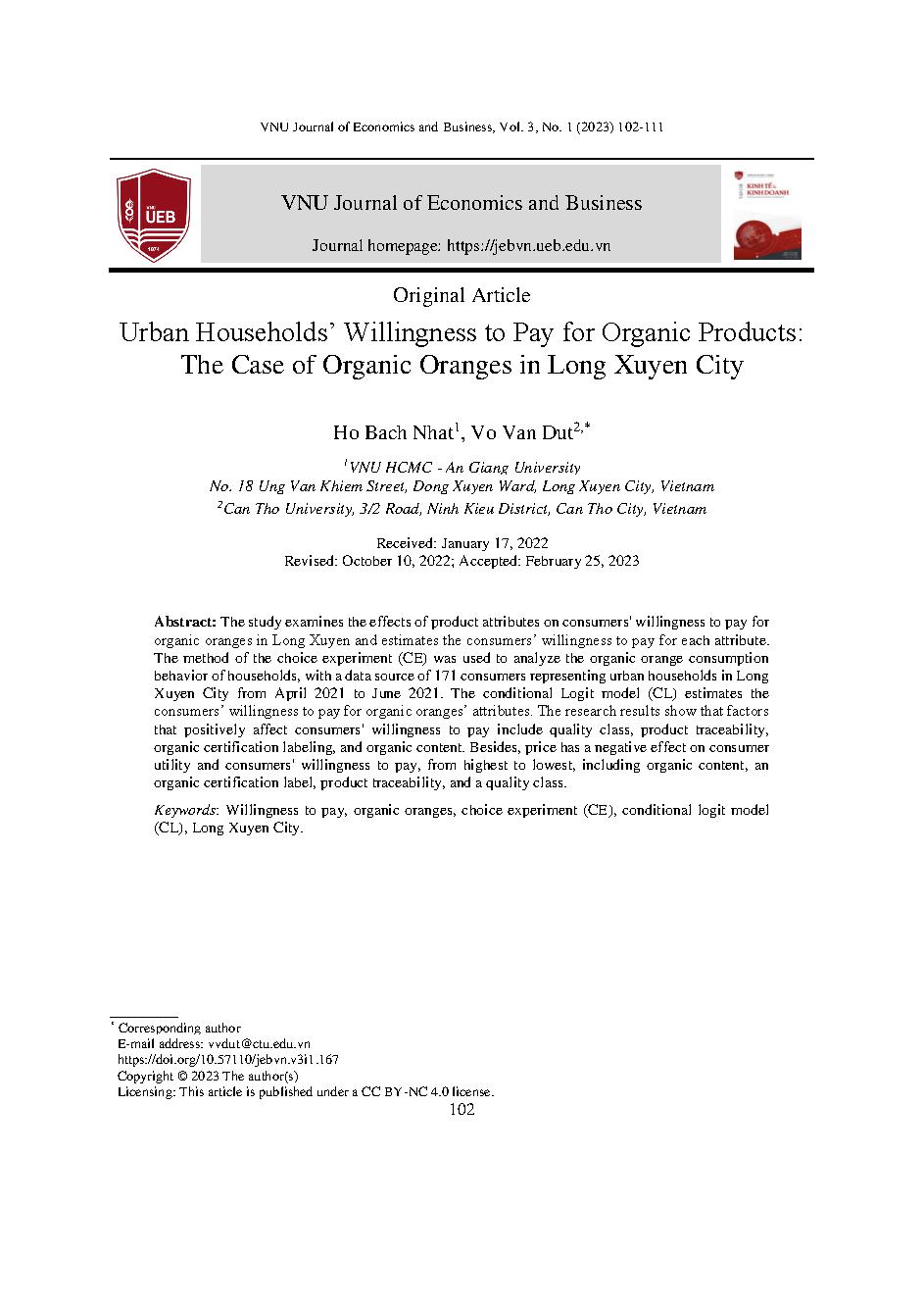Sự sẵn lòng chi trả của hộ gia đình ở thành thị đối với sản phẩm hữu cơ: Trường hợp cam hữu cơ tại thành phố Long Xuyên = Urban Households' Willingness to Pay for Organic Products: The Case of Organic Oranges in Long Xuyen City