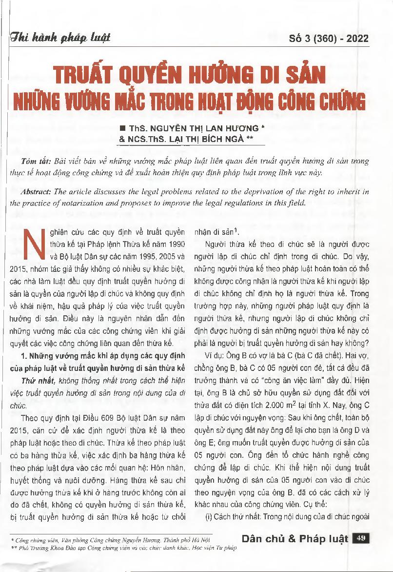 Truất quyền hưởng di sản những vướng mắc trong hoạt động công chứng = Deprivation of the right to inherit - Problems in notary activities
