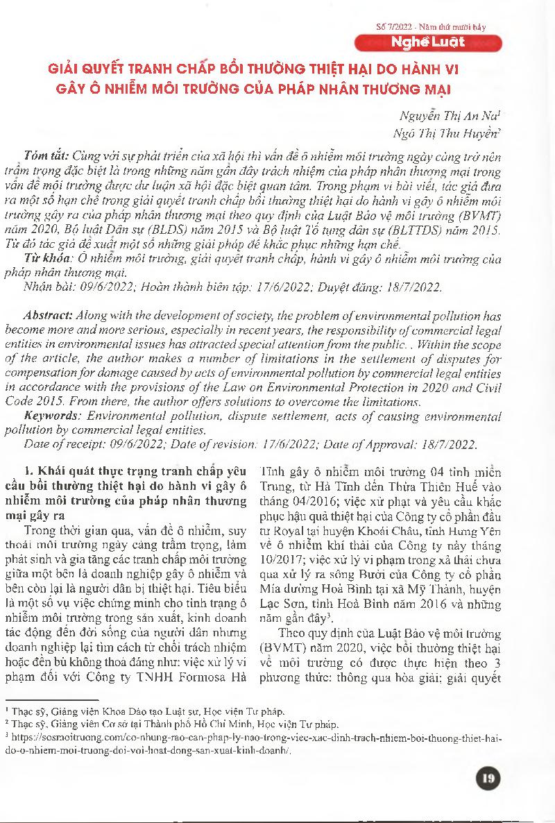 Giải quyết tranh chấp bồi thường thiệt hại do hành vi gây ô nhiễm môi trường của pháp nhân thương mại = Solving disputes over damage compensation for the environmental pollution caused by commercial entity
