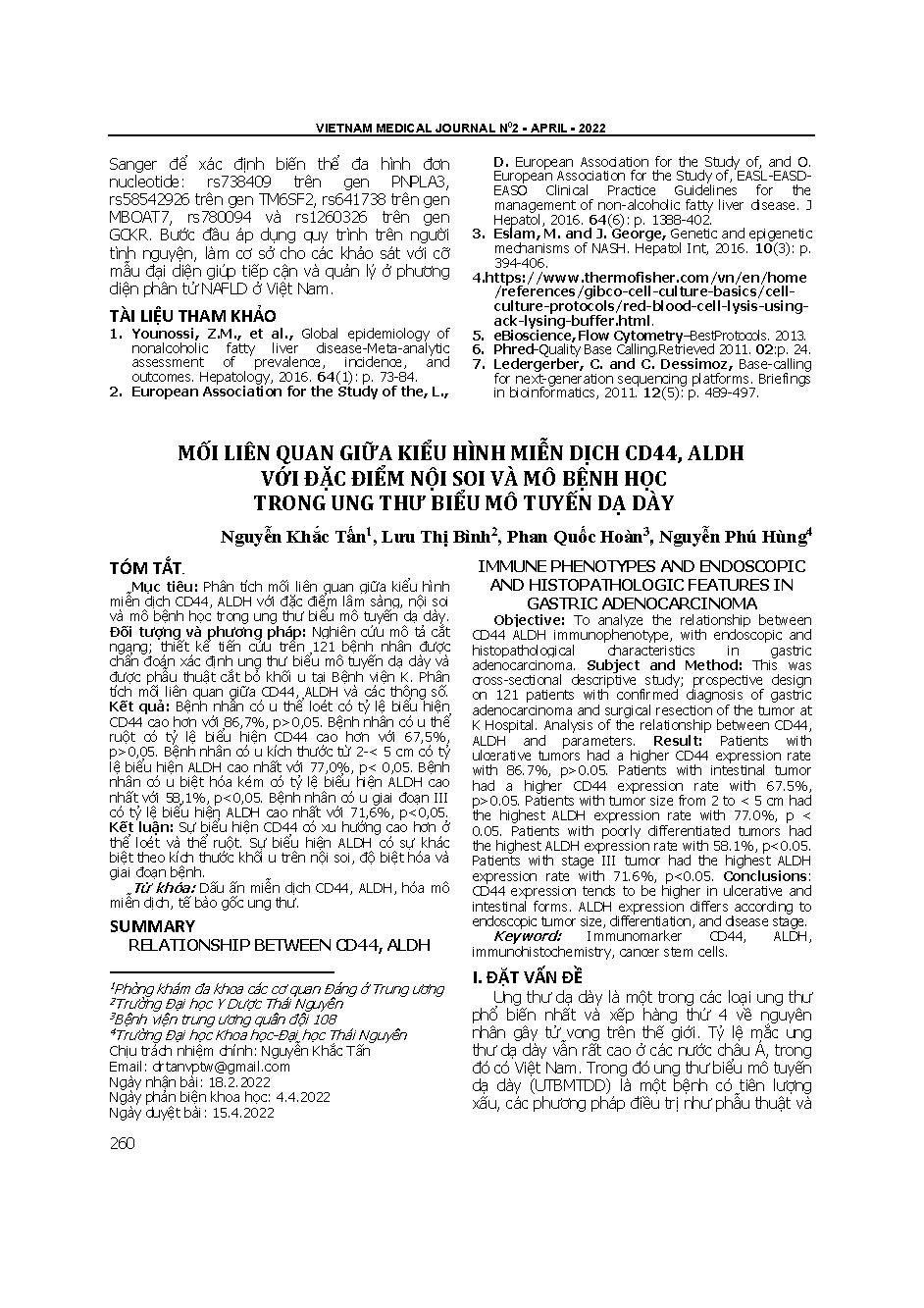 Mối liên quan giữa kiểu hình miễn dịch CD44, ALDH với đặc điểm nội soi và mô bệnh học trong ung thư biểu mô tuyến dạ dày = Relationship between CD44, ALDH immune phenotypes and endoscopic and histopathologic features in gastric adenocarcinoma