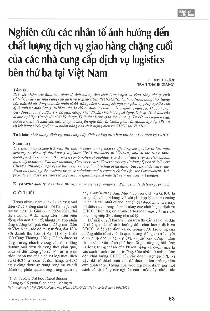 Nghiên cứu các nhân tố ảnh hưởng đến chất lượng dịch vụ giao hàng chặng cuối của các nhà cung cấp dịch vụ logistics bên thứ ba tại Việt Nam = Research on factors impacting the quality of last mile delivery services of third-party logistics providers in Vi