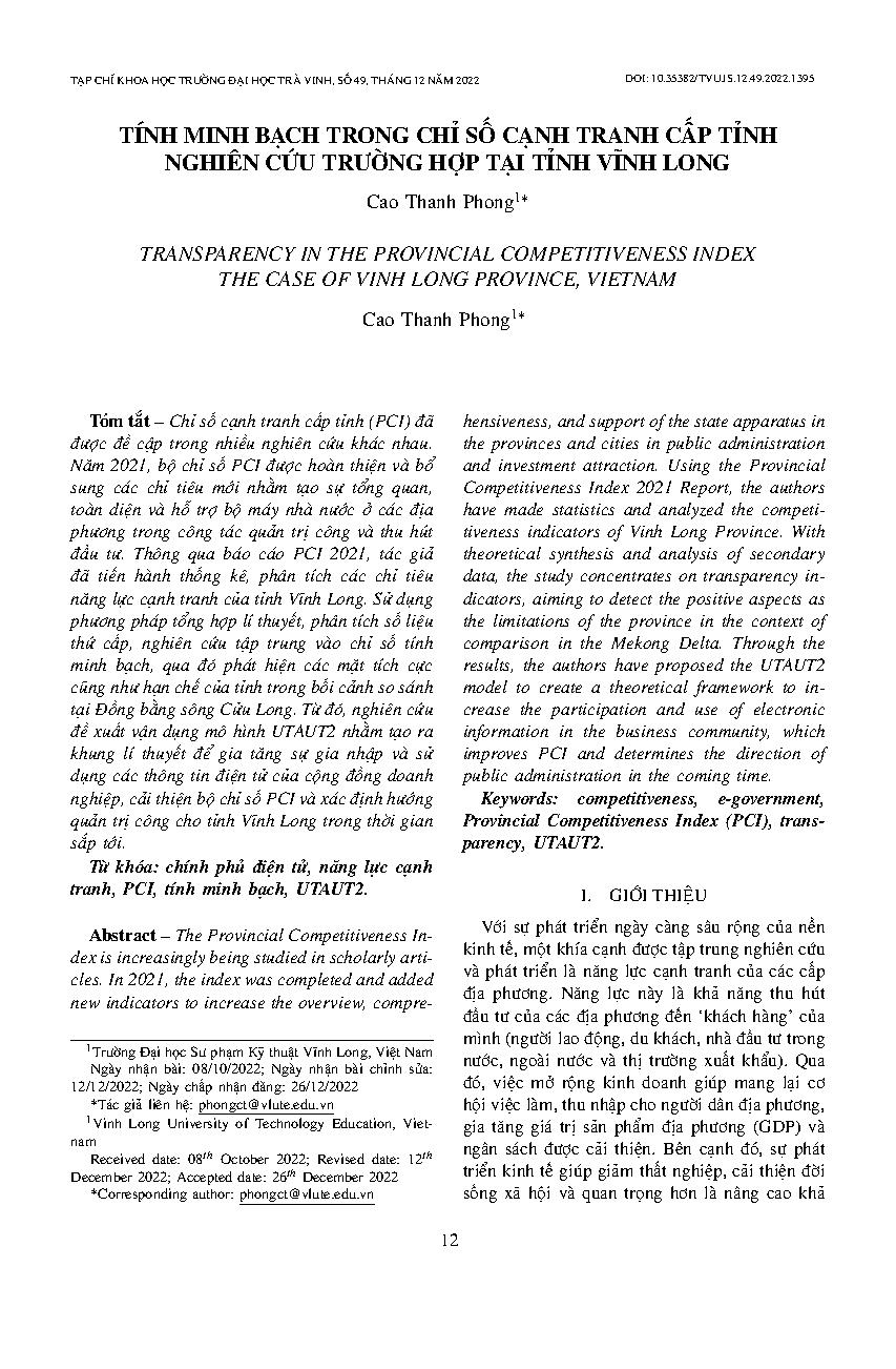 Tính minh bạch trong chỉ số cạnh tranh cấp tỉnh nghiên cứu trường hợp tại tỉnh Vĩnh Long = Transparency in the provincial competitiveness index the case of Vinh Long province, Vietnam