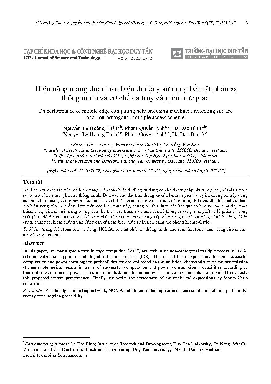 Hiệu năng mạng điện toán biên di động sử dụng bề mặt phản xạ thông minh và cơ chế đa truy cập phi trực giao = On performance of mobile edge computing network using intelligent reflecting surface and non-orthogonal multiple access scheme
