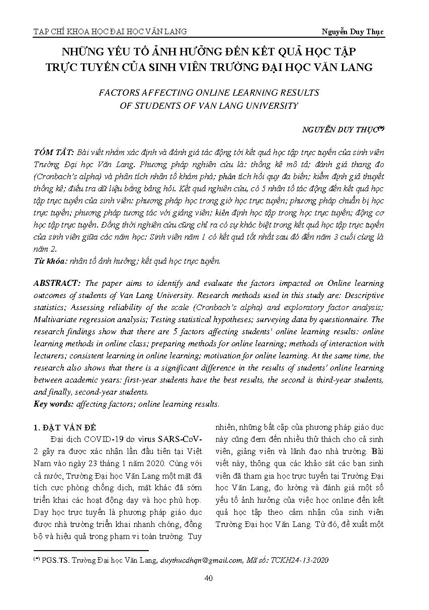 Những yếu tố ảnh hưởng đến kết quả học tập trực tuyến của sinh viên trường Đại học Văn Lang = Factors affecting online learning results of students of Van Lang University