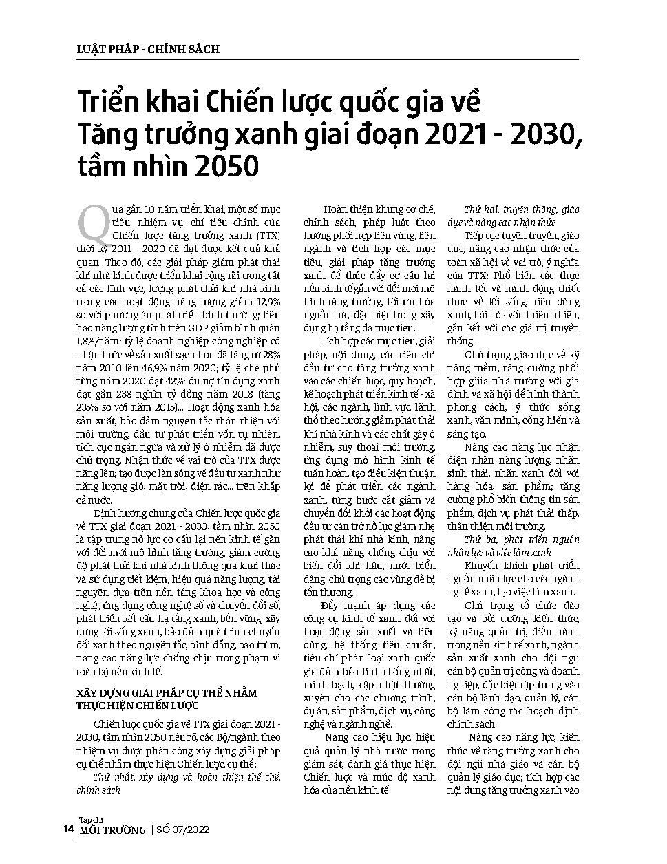 Triển khai Chiến lược quốc gia về Tăng trưởng xanh giai đoạn 2021 - 2030, tầm nhìn 2050