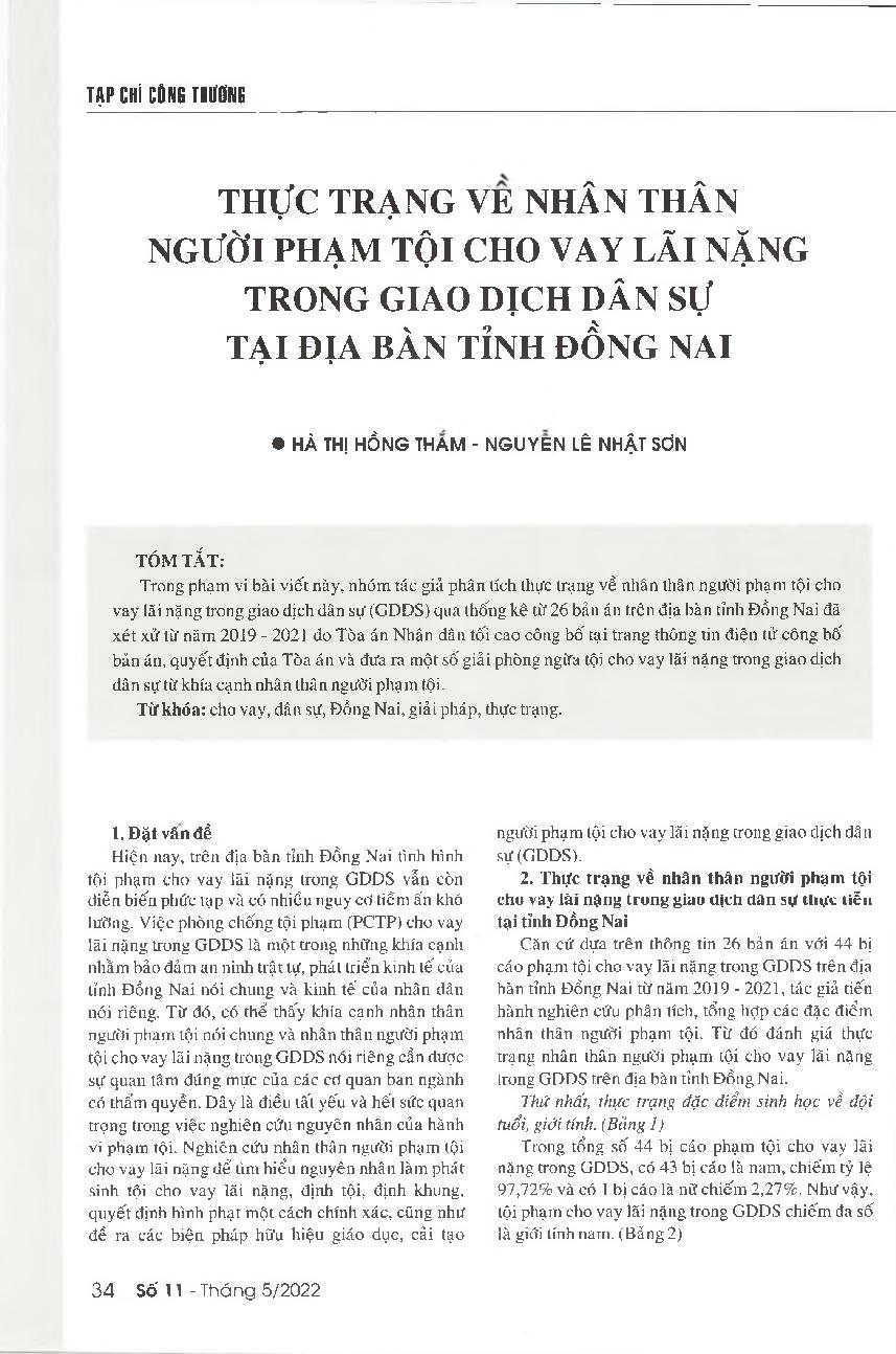 Thực trạng về nhân thân người phạm tội cho vay lãi nặng trong giao dịch dân sự tại địa bàn tỉnh Đồng Nai = Record of the offender accused of usury in civil transactions in Dong Nai province