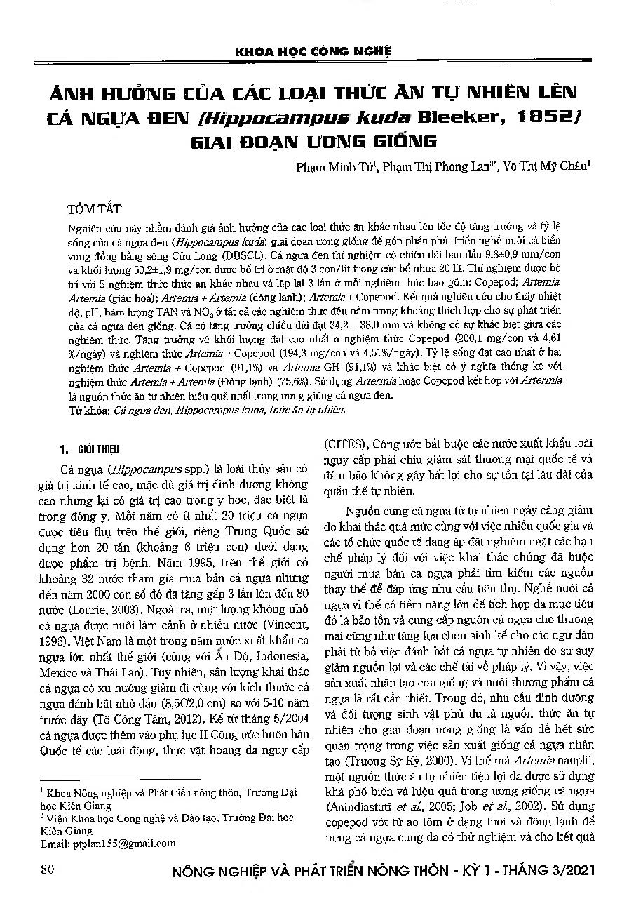 Ảnh hưởng của các loại thức ăn tự nhiên lên cá ngựa đen (Hippocampus kuda Bleeker, 1852) giai đoạn ương giống = Effects of live foods on the yellow seahorse at the nursing stage (Hippocampus kuda Bleeker, 1852)