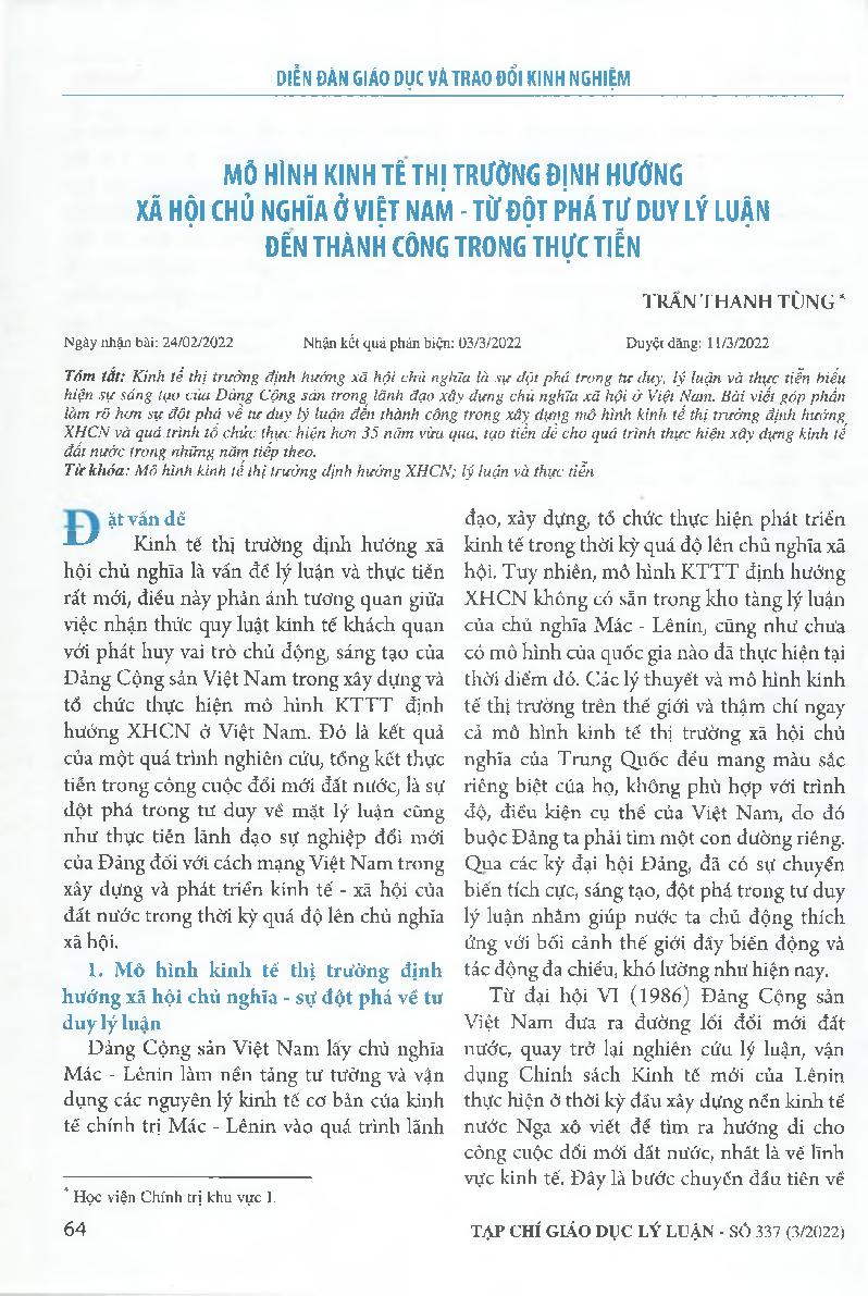 Mô hình kinh tế thị trường định hướng xã hội chủ nghĩa ở Việt Nam - từ đột phá tư duy lý luận đến thành công trong thực tiễn