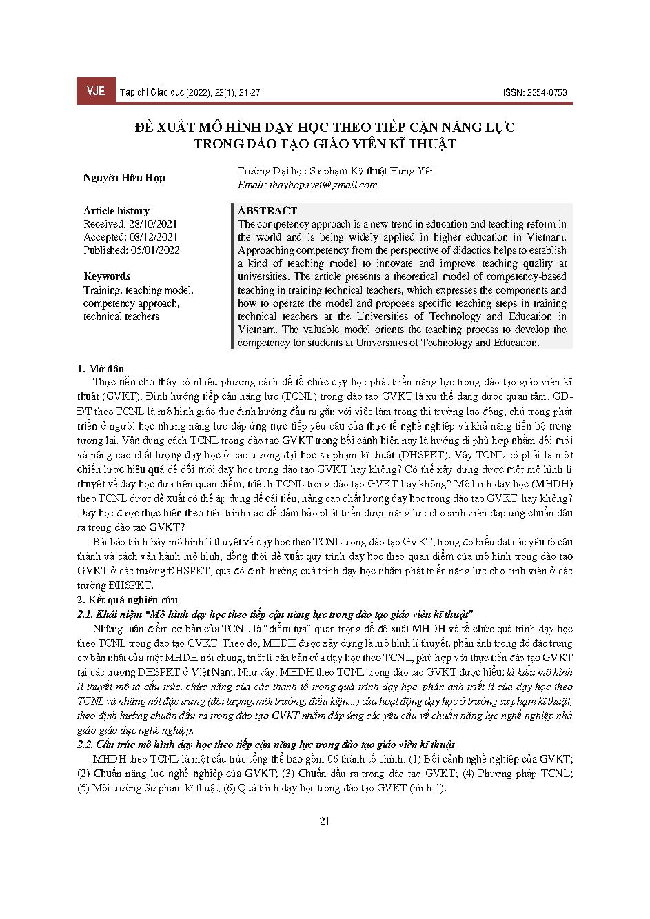 Đề xuất mô hình dạy học theo tiếp cận năng lực trong đào tạo giáo viên kĩ thuật = Proposing a competency-based teaching model in training technical teachers