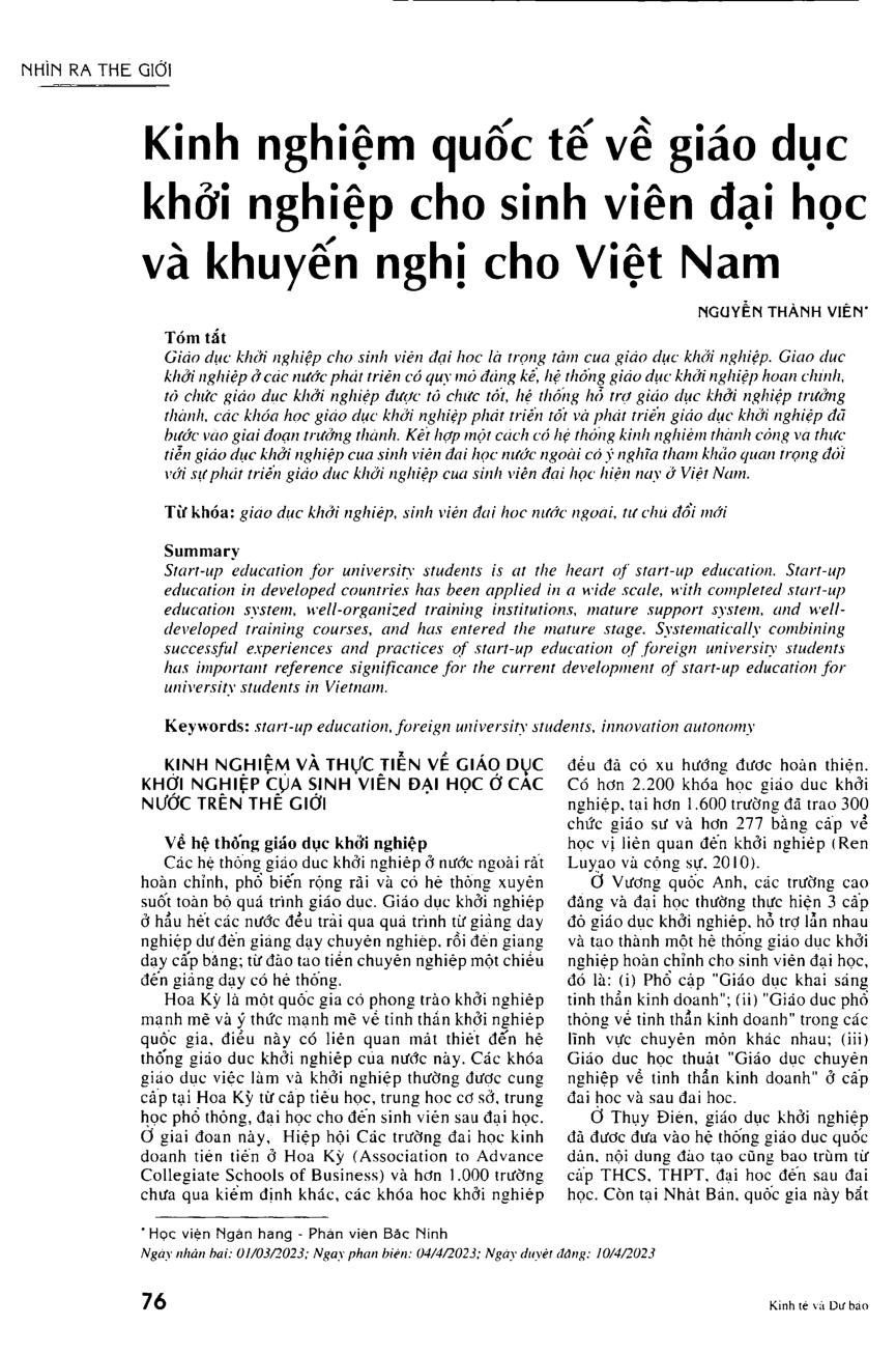 Kinh nghiệm quốc tế về giáo dục khởi nghiệp cho sinh viên đại học và khuyến nghị cho Việt Nam
