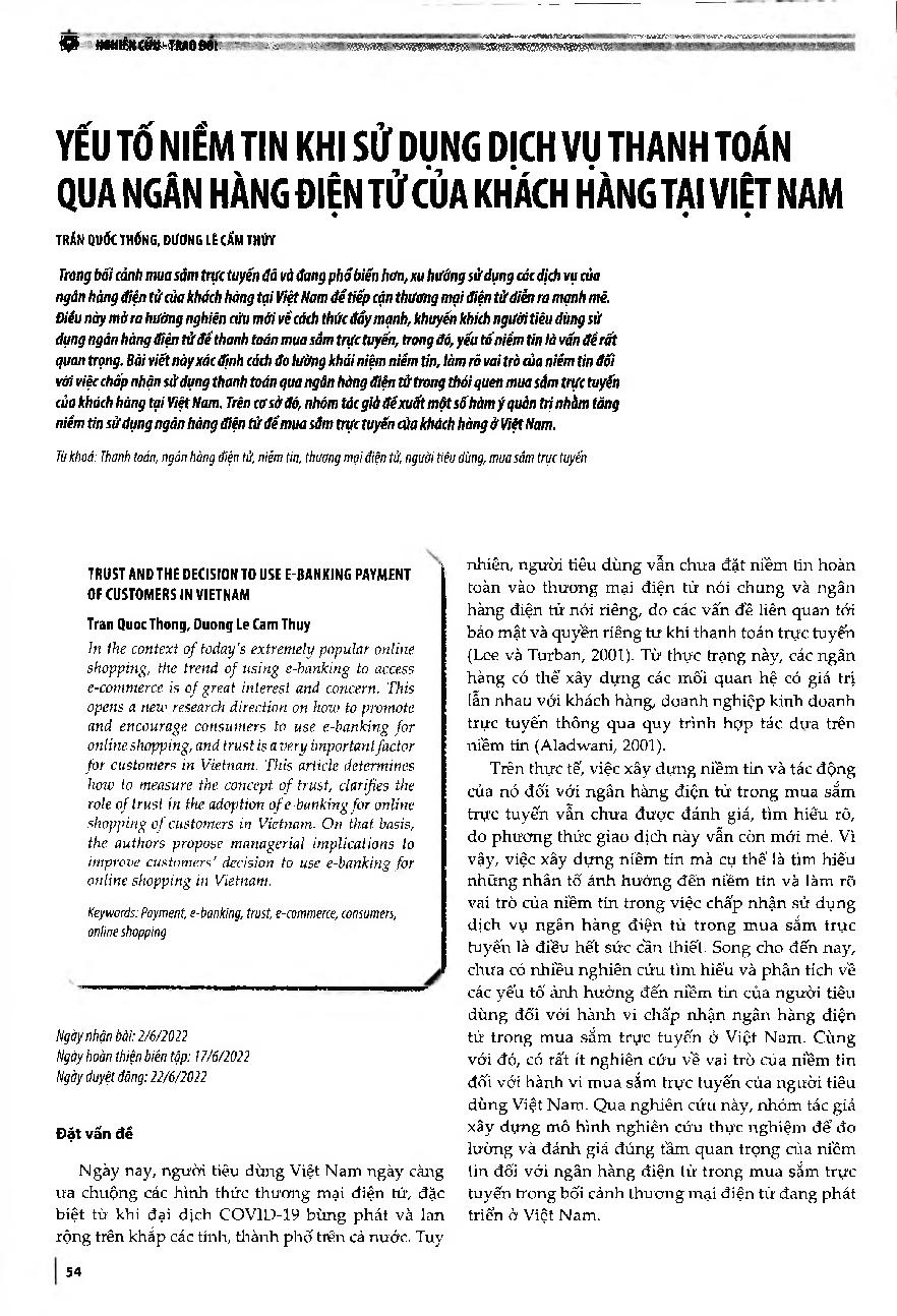 Yếu tố niềm tin khi sử dụng dịch vụ thanh toán qua ngân hàng điện tử của khách hàng tại Việt Nam = Trust and the decision to use e-banking payment of customers in Vietnam