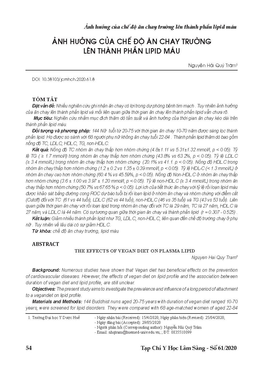 Ảnh hưởng của chế độ ăn chay trường lên thành phần lipid máu = The effects of vegan diet on plasma lipid