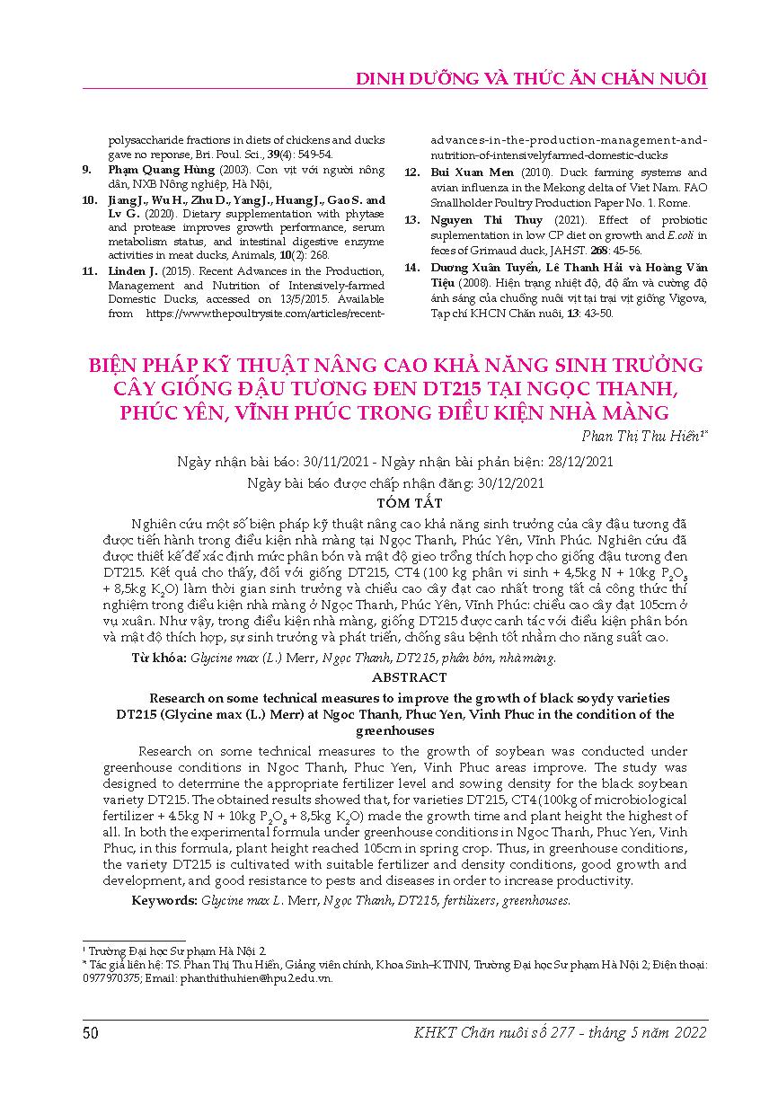 Biện pháp kỹ thuật nâng cao khả năng sinh trưởng cây giống đậu tương đen DT215 tại Ngọc Thanh, Phúc Yên, Vĩnh Phúc trong điều kiện nhà màng = Research on some technical measures to improve the growth of black soydy varieties DT215 (Glycine max (L.) Merr)