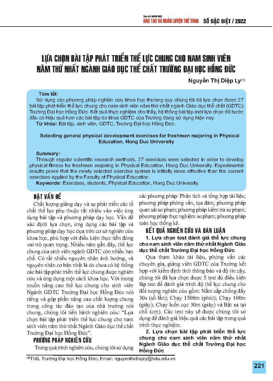 Lựa chọn bài tập phát triển thể lực chung cho nam sinh viên năm thứ nhất Ngành Giáo dục thể chất Trường Đại học Hồng Đức = Selecting general physical development exercises for freshmen majoring in Physical Education, Hong Duc University