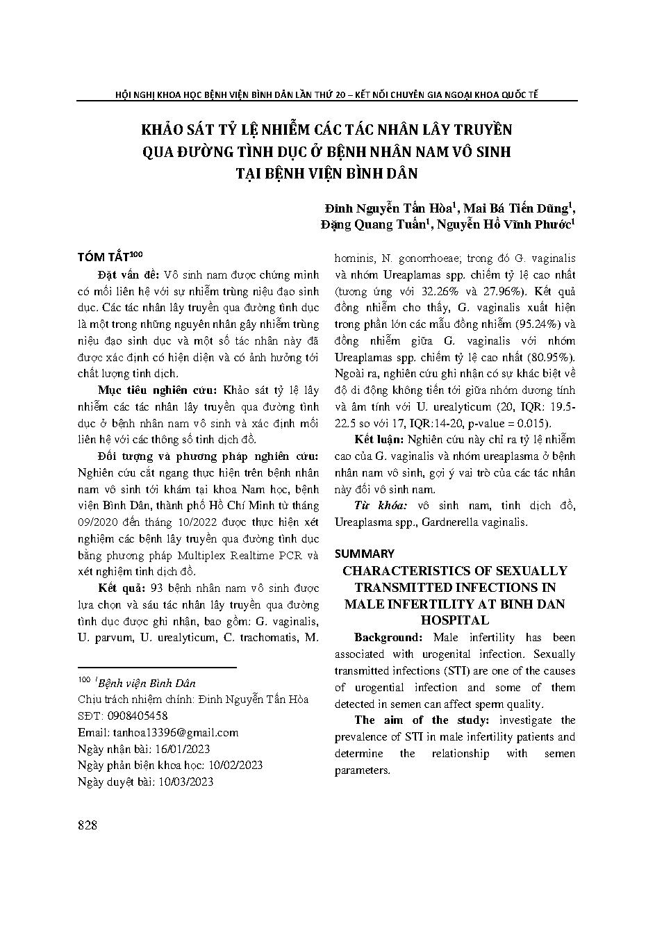 Khảo sát tỷ lệ nhiễm các tác nhân lây truyền qua đường tình dục ở bệnh nhân nam vô sinh tại Bệnh viện Bình Dân