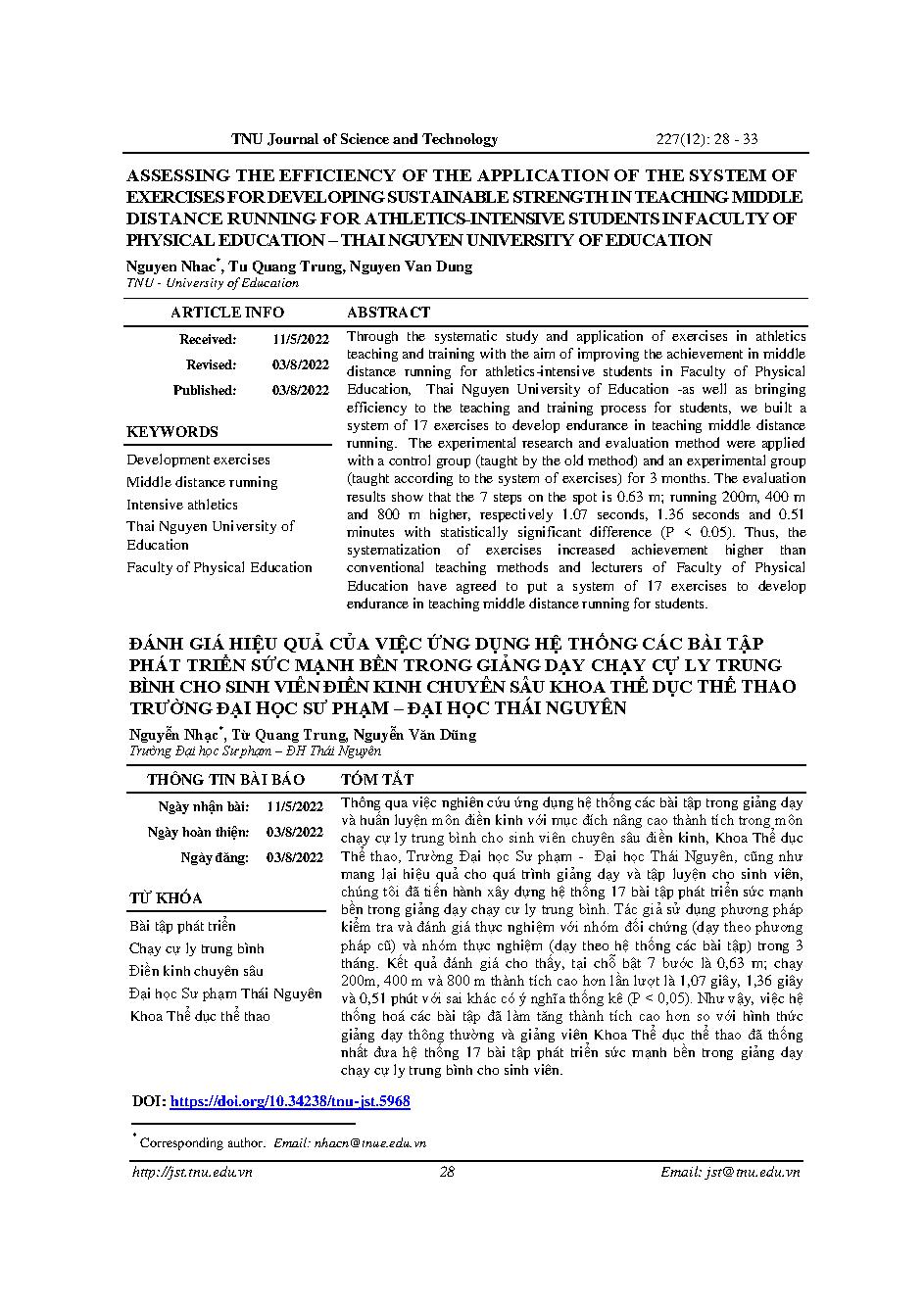 đánh giá hiệu quả của việc ứng dụng hệ thống các bài tập Phát triển sức mạnh bền trong giảng dạy chạy cự ly trung bình cho sinh viên điền kinh chuyên sâu khoa thể dục thể thao trường đại học sư phạm – đại học Thái Nguyên = assessing the efficiency of the