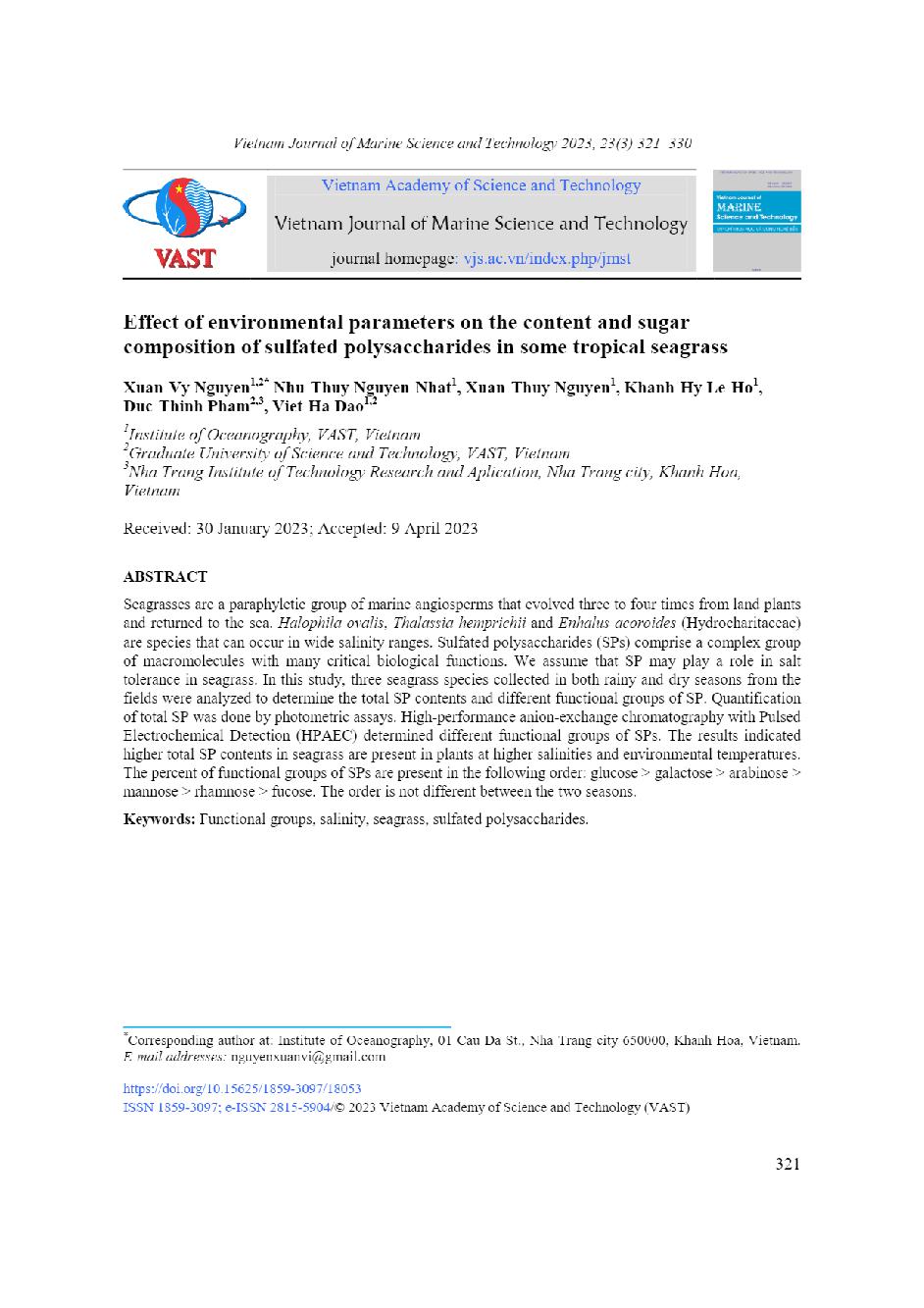 Ảnh hưởng của các thông số môi trường đến hàm lượng và thành phần đường của polysaccharid sunfat ở một số loài cỏ biển nhiệt đới = Effect of environmental parameters on the content and sugar composition of sulfated polysaccharides in some tropical seagras