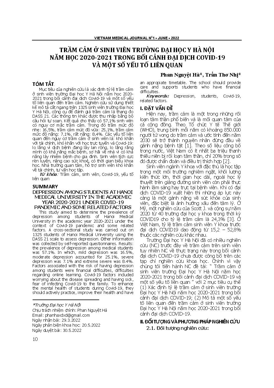 Trầm cảm ở sinh viên trường Đại học Y Hà Nội năm học 2020-2021 trong bối cảnh đại dịch Covid-19 và một số yếu tố liên quan = Depression among students at Hanoi medical university in the academic year 2020-2021 under Covid-19 pandemic and some related fact