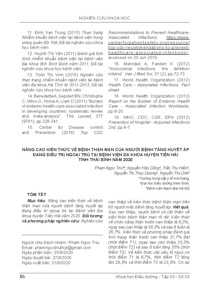 Nâng cao kiến thức về bệnh thận mạn của người bệnh tăng huyết áp đang điều trị ngoại trú tại bệnh viện đa khoa huyện Tiền Hải tỉnh Thái Bình năm 2020 = Improving the knowledge of chronic kidney disease for out-patients with hypertension in Tien Hai district general hospital Thai Binh province in 2020