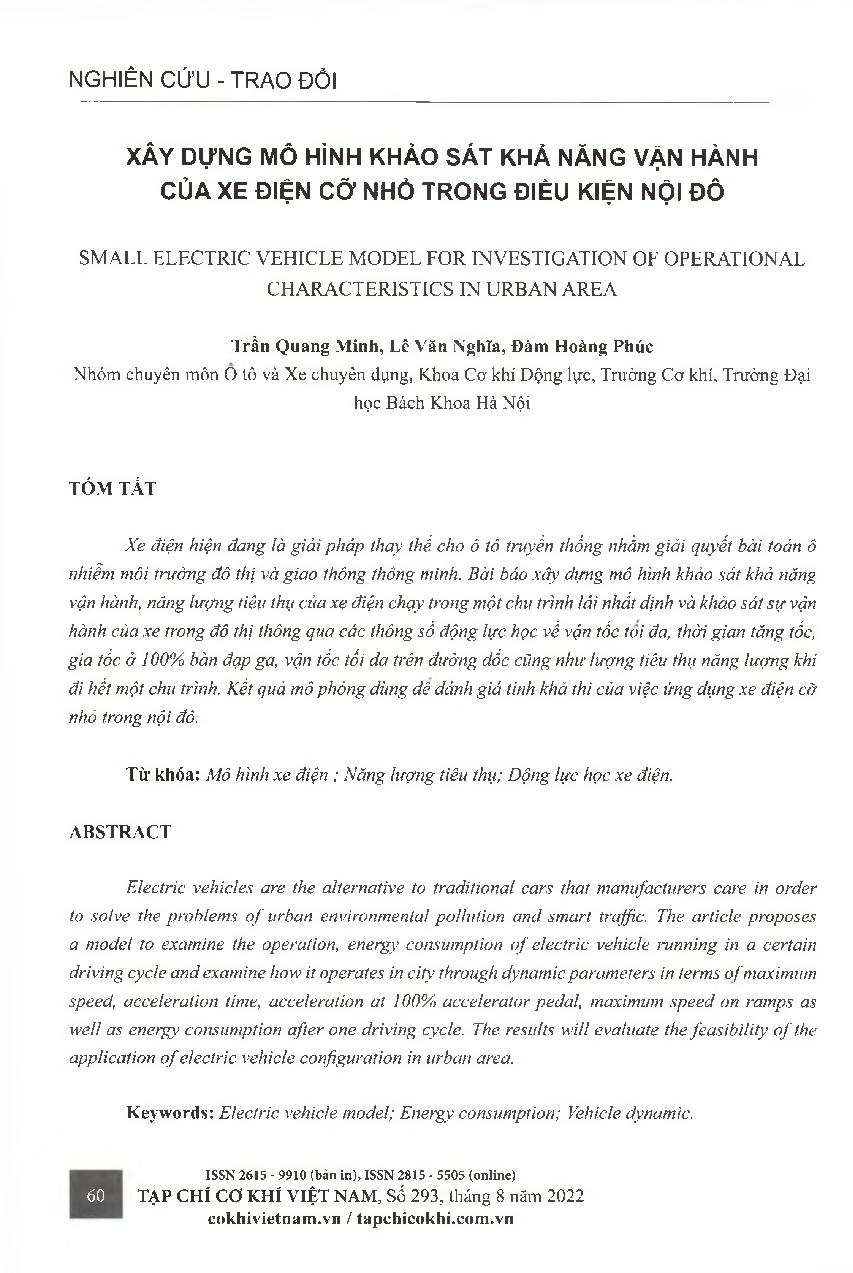 Xây dựng mô hình khảo sát khả năng vận hành của xe điện cỡ nhỏ trong điều kiện nội đô = Small electric vehicle model for investigation of operational characteristics in urban area