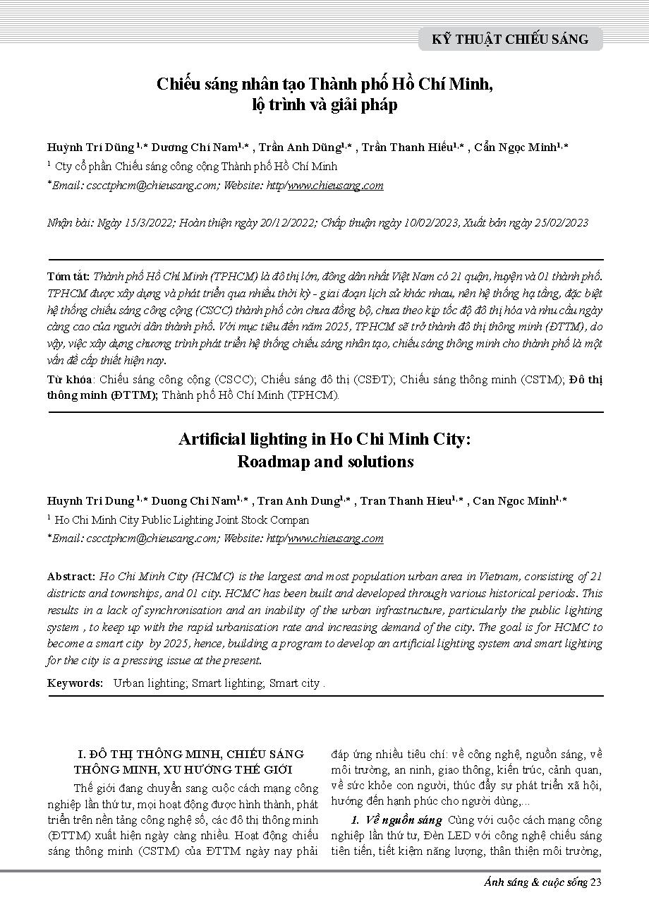 Chiếu sáng nhân tạo Thành phố Hồ Chí Minh, lộ trình và giải pháp = Artificial lighting in Ho Chi Minh City: Roadmap and solutions