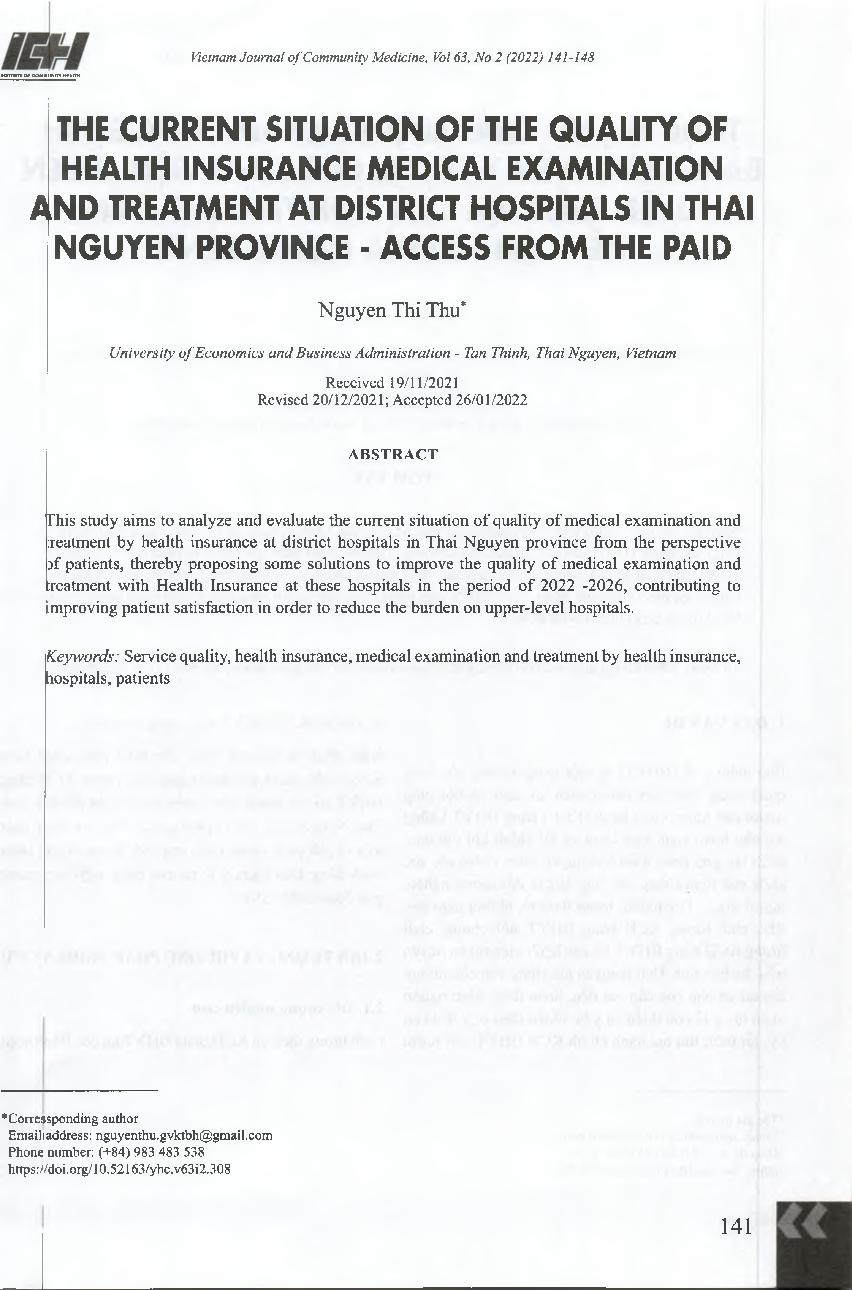 Thực trạng chất lượng khám chữa bệnh bằng bảo hiểm y tế tại các bệnh viện tuyến huyện trên địa bàn tỉnh Thái Nguyên - tiếp cận từ phía người bệnh = The current situation of the quality of health insurance medical examination and treatment at district