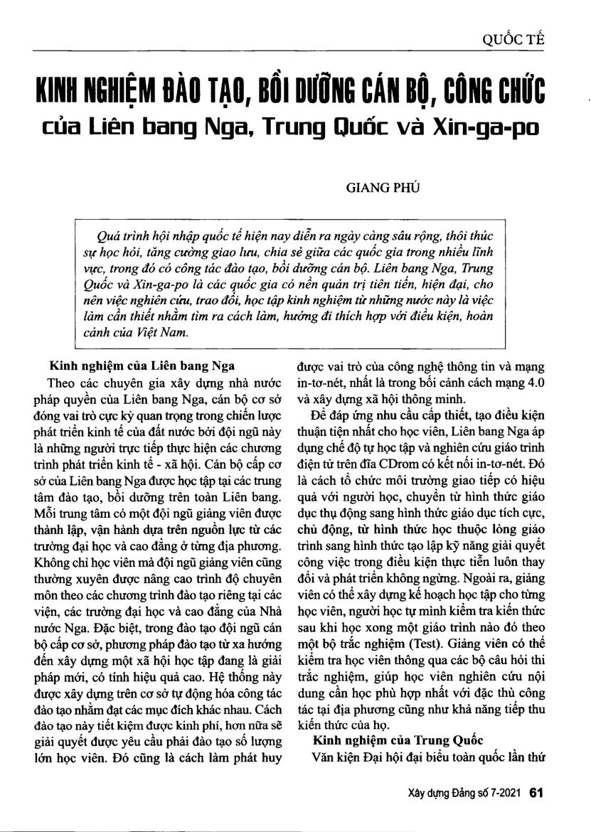 Kinh nghiệm đào tạo, bồi dưỡng cán bộ, công chức của Liên bang Nga, Trung Quốc và Xin-ga-po