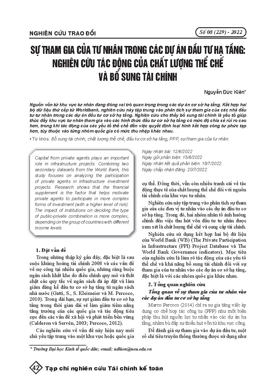 Sự tham gia của tư nhân trong các dự án đầu tư hạ tầng: Nghiên cứu tác động của chất lượng thể chế và bổ sung tài chính = Private participation for infrastructure projects: Studying the impact of institutional quality and financial supplement