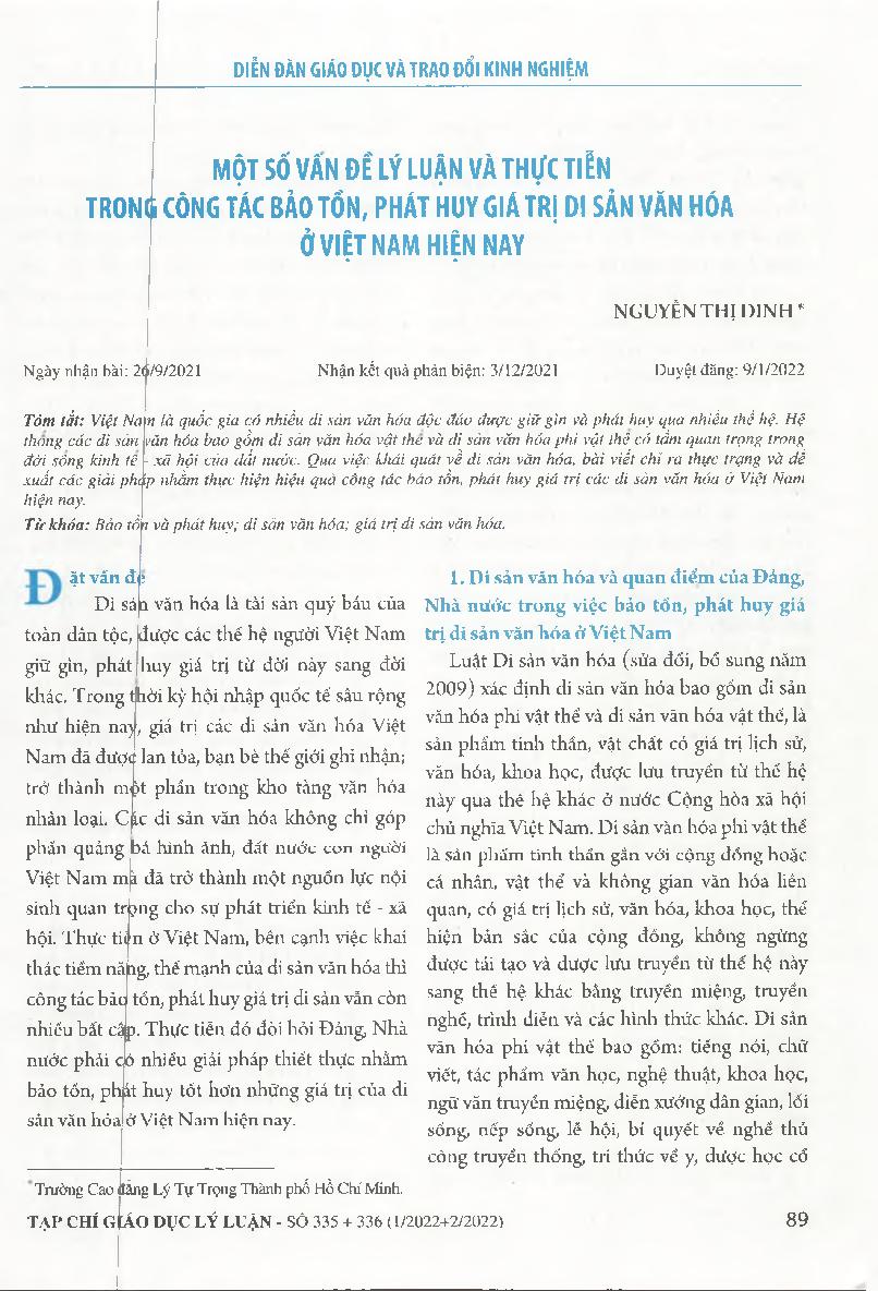 Một số vấn để lý luận và thực tiễn trong công tác bảo tồn, phát huy giá trị di sản văn hóa ở Việt Nam hiện nay