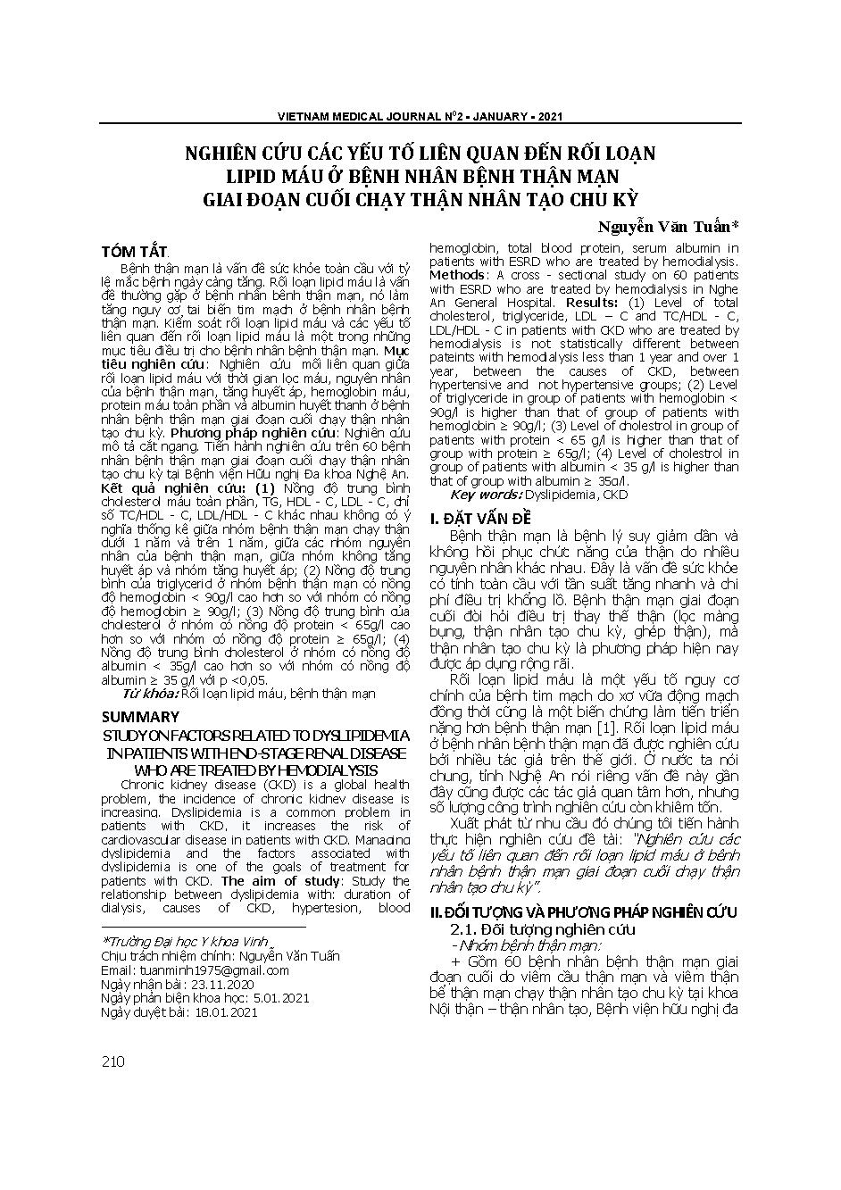 Nghiên cứu các yếu tố liên quan đến rối loạn lipid máu ở bệnh nhân bệnh thận mạn giai đoạn cuối chạy thận nhân tạo chu kỳ = Study on factors related to dyslipidemia in patients with end-stage renal disease who are treated by hemodialysis