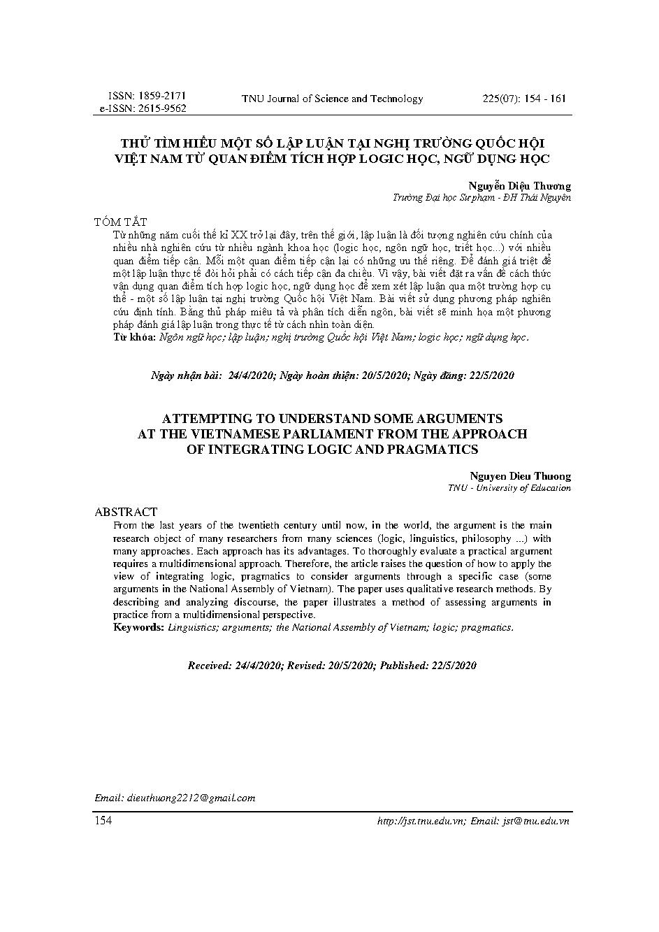 Thử tìm hiểu một số lập luận tại nghị trường quốc hội Việt Nam từ quan điểm tích hợp logic học, ngữ dụng học = Attempting to understand some arguments at the Vietnamese parliament from the approach of integrating logic and pragmatics