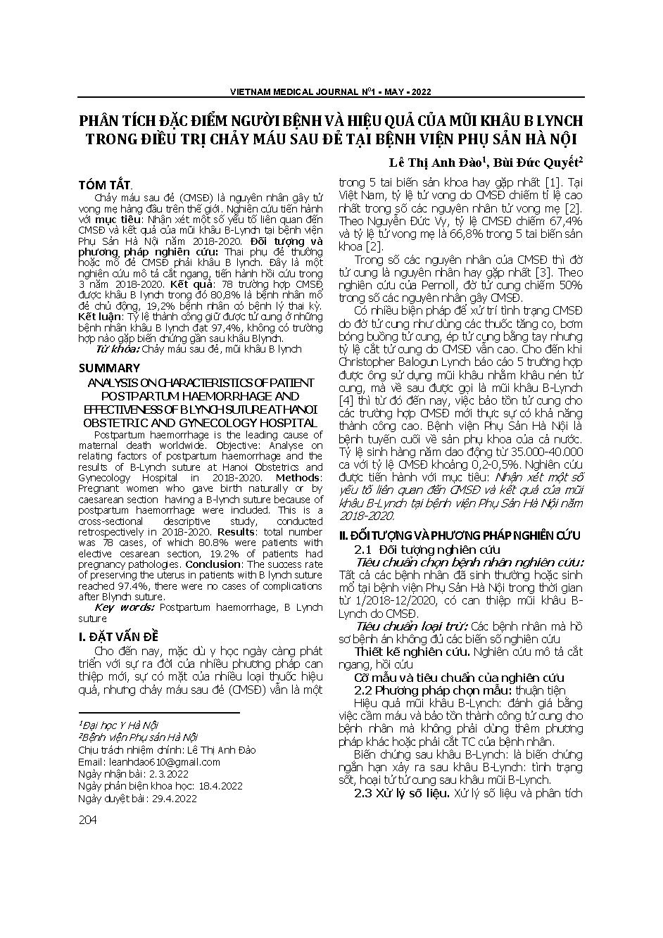 Phân tích đặc điểm người bệnh và hiệu quả của mũi khâu B Lynch trong điều trị chảy máu sau đẻ tại Bệnh viện Phụ sản Hà Nội = Analysis on characteristics of patient postpartum haemorrhage and effectiveness of B Lynch suture at Hanoi obstetric and gynecolog