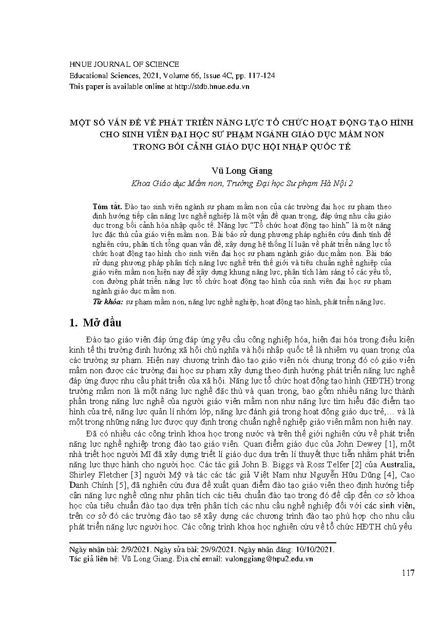 Một số vấn đề về phát triển năng lực tổ chức hoạt động tạo hình cho sinh viên đại học sư phạm ngành giáo dục mầm non trong bối cảnh giáo dục hội nhập quốc tế = Issues on developing capacity to organize shaping activities for preschool teachers of pedagogical university students majoring in preschool education in the context of international integral education