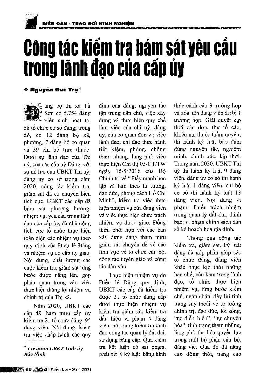 Công tác kiểm tra bám sát yêu cầu trong lãnh đạo của cấp ủy