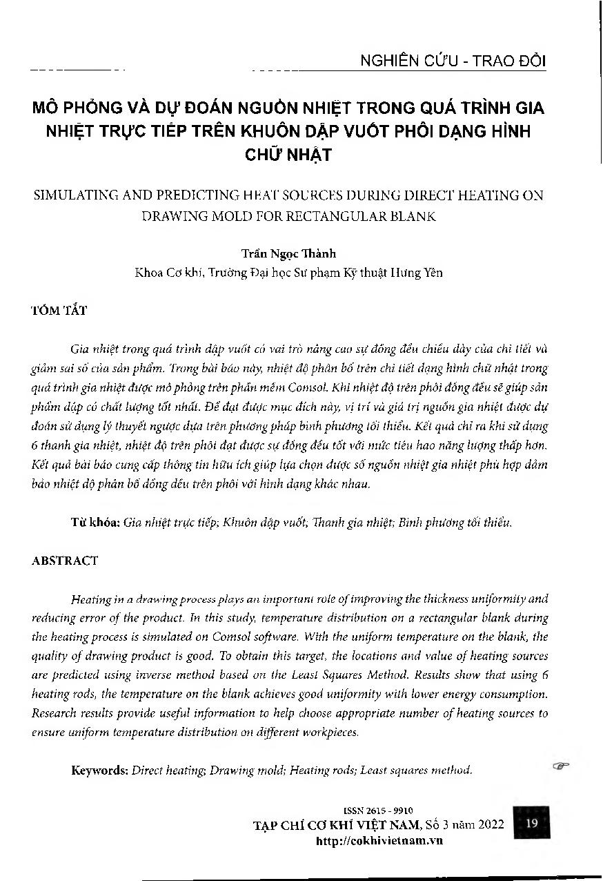 Mô phỏng và dự đoán nguồn nhiệt trong quá trình gia nhiệt trực tiếp trên khuôn dập vuốt phôi dạng hình chữ nhật = Simulating and predicting heat sources during direct heating on drawing mold for rectangular blank