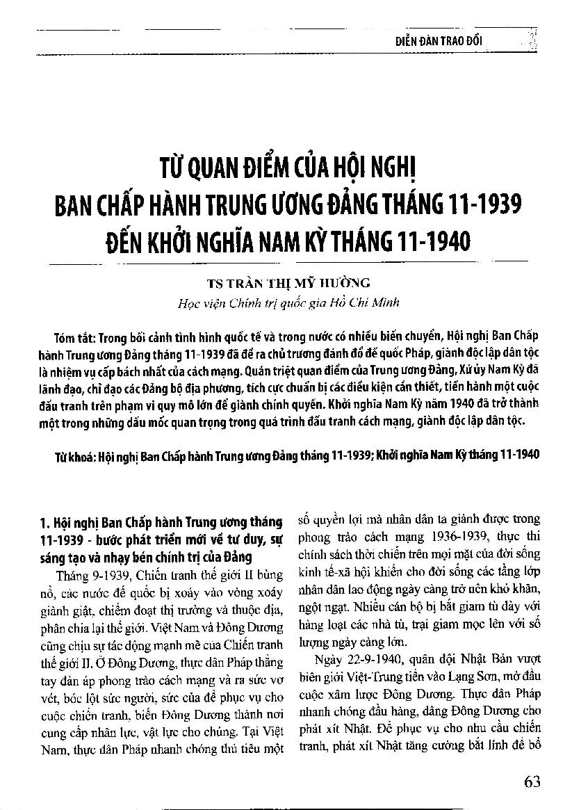 Từ quan điểm của hội nghị ban chấp hành trung ương Đảng tháng 11-1939 đến khởi nghĩa Nam Kỳ tháng 11-1940