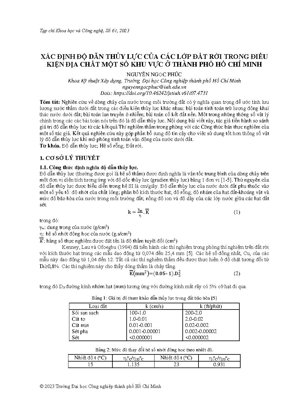 Xác định độ dẫn thủy lực của các lớp đất rời trong điều kiện địa chất một số khu vực ở thành phố Hồ Chí Minh = To evaluate the hydraulic conductivity coefficient of non-cohesive soil in geological conditions of some area in hochiminh city