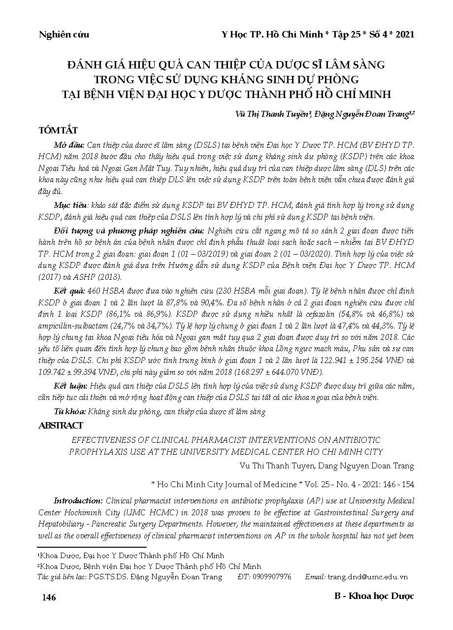 Đánh giá hiệu quả can thiệp của dược sĩ lâm sàng trong việc sử dụng kháng sinh dự phòng tại Bệnh viện Đại học Y dược thành phố Hồ Chí Minh = Effectiveness of clinical pharmacist interventions on antibiotic prophylaxis use at the university medical center Ho Chi Minh city