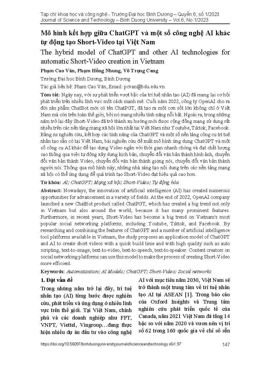 Mô hình kết hợp giữa ChatGPT và một số công nghệ AI khác tự động tạo Short-Video tại Việt Nam = The hybrid model of ChatGPT and other AI technologies for automatic Short-Video creation in Vietnam