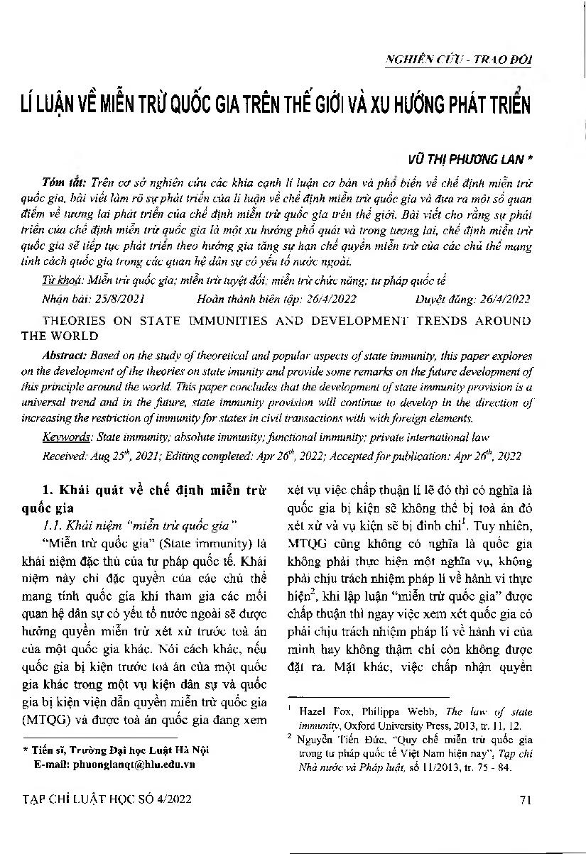Lí luận về miễn trừ quốc gia trên thế giới và xu hướng phát triển = Theories on state immunities and development trends around the world