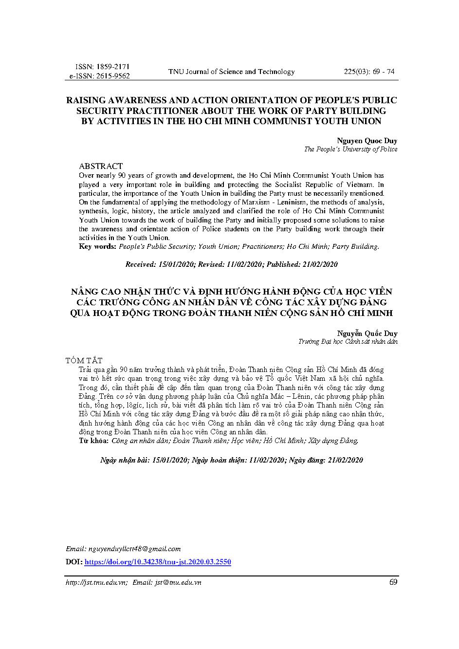 NÂNG CAO NHẬN THỨC VÀ ĐỊNH HƯỚNG HÀNH ĐỘNG CỦA HỌC VIÊN CÁC TRƯỜNG CÔNG AN NHÂN DÂN VỀ CÔNG TÁC XÂY DỰNG ĐẢNG QUA HỌAT ĐỘNG TRONG ĐÒAN THANH NIÊN CỘNG SẢN HỒ CHÍ MINH = RAISING AWARENESS AND ACTION ORIENTATION OF PEOPLE'S PUBLIC SECURITY PRACTITIONER ABOUT THE WORK OF PARTY BUILDING BY ACTIVITIES IN THE HO CHI MINH COMMUNIST YOUTH UNION