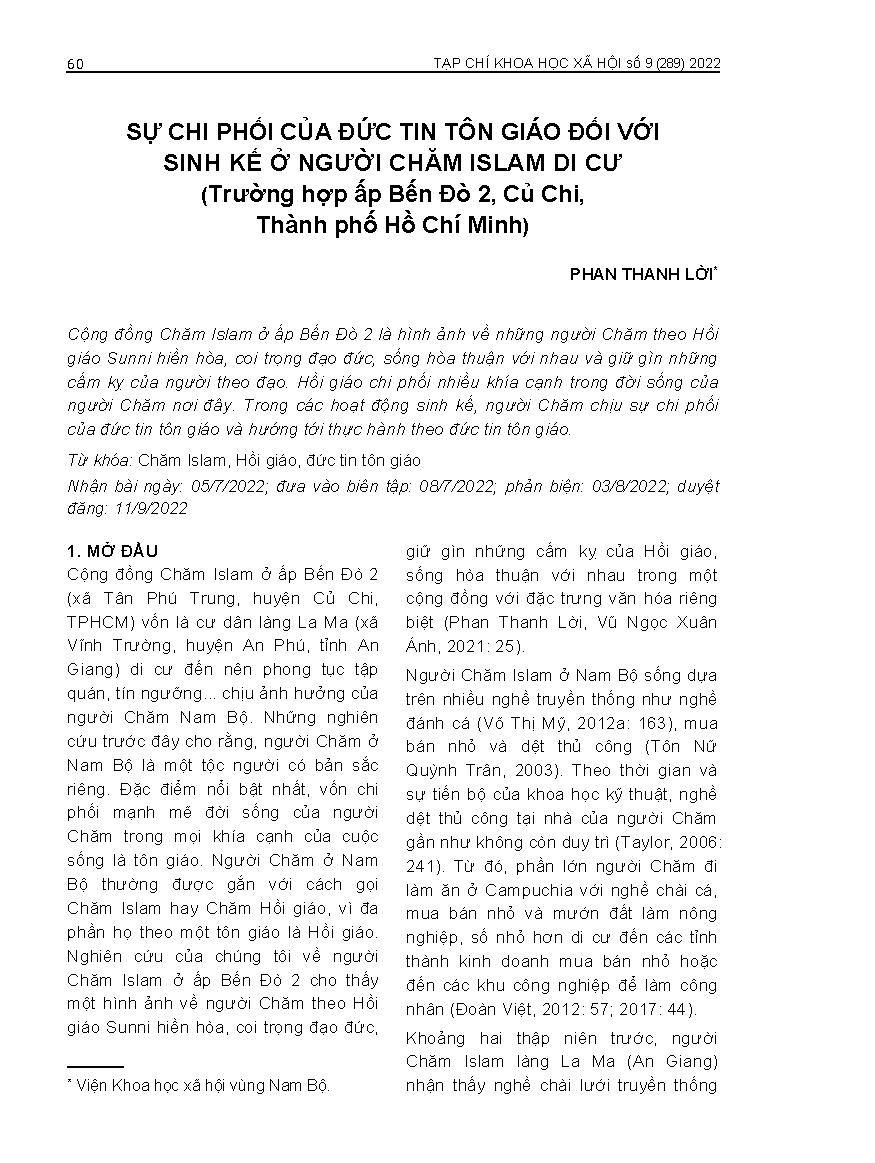 Sự chi phối của đức tin tôn giáo đối với sinh kế ở người Chăm Islam di cư (Trường hợp ấp Bến Đò 2, Củ Chi, Thành phố Hồ Chí Minh) = Influences of religious faith for the livelihood of Cham Muslims migrants (The case of Ben Do 2 hamlet, Cu Chi, Ho Chi Minh