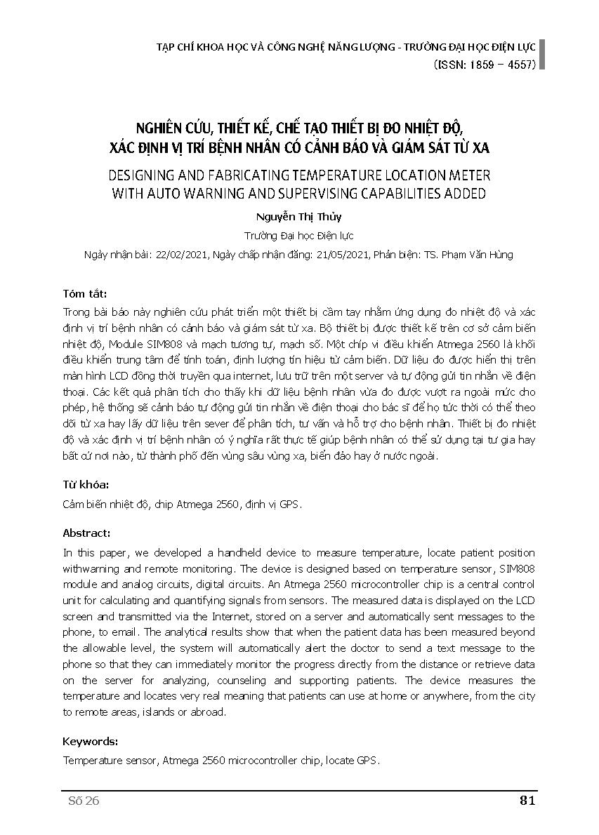 Nghiên cứu, thiết kế, chế tạo thiết bị đo nhiệt độ, xác định vị trí bệnh nhân có cảnh báo và giám sát từ xa = Designing and fabricating temperature location meter with auto warning and supervising capabilities added