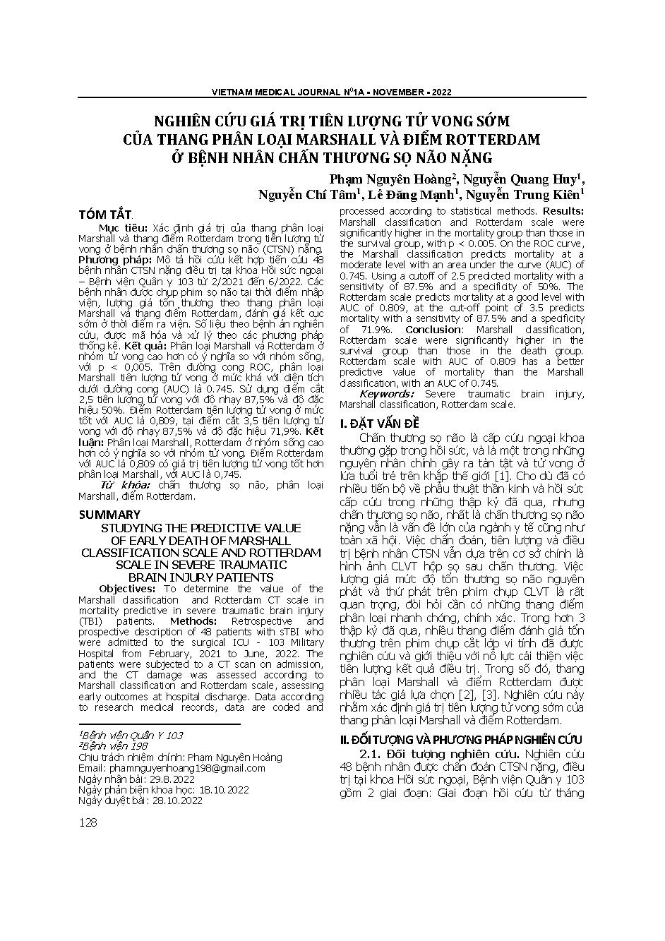 Nghiên cứu giá trị tiên lượng tử vong sớm của thang phân loại Marshall và điểm Rotterdam ở bệnh nhân chấn thương sọ não nặng = Studying the predictive value of early death of Marshall classification scale and Rotterdam scale in severe traumatic brain inju