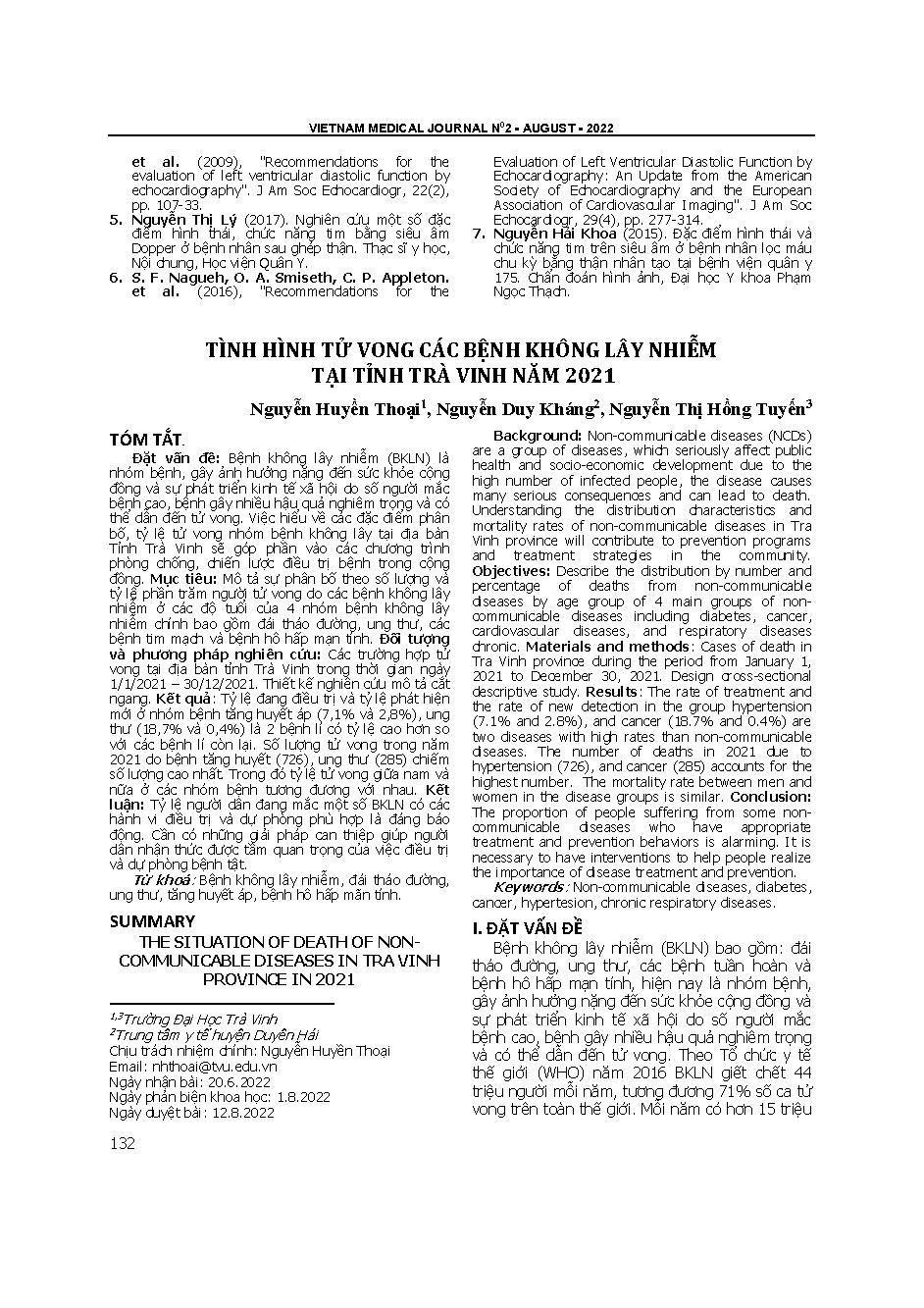 Tình hình tử vong các bệnh không lây nhiễm tại tỉnh Trà Vinh năm 2021 = The situation of death of non-communicable diseases in Tra Vinh province in 2021