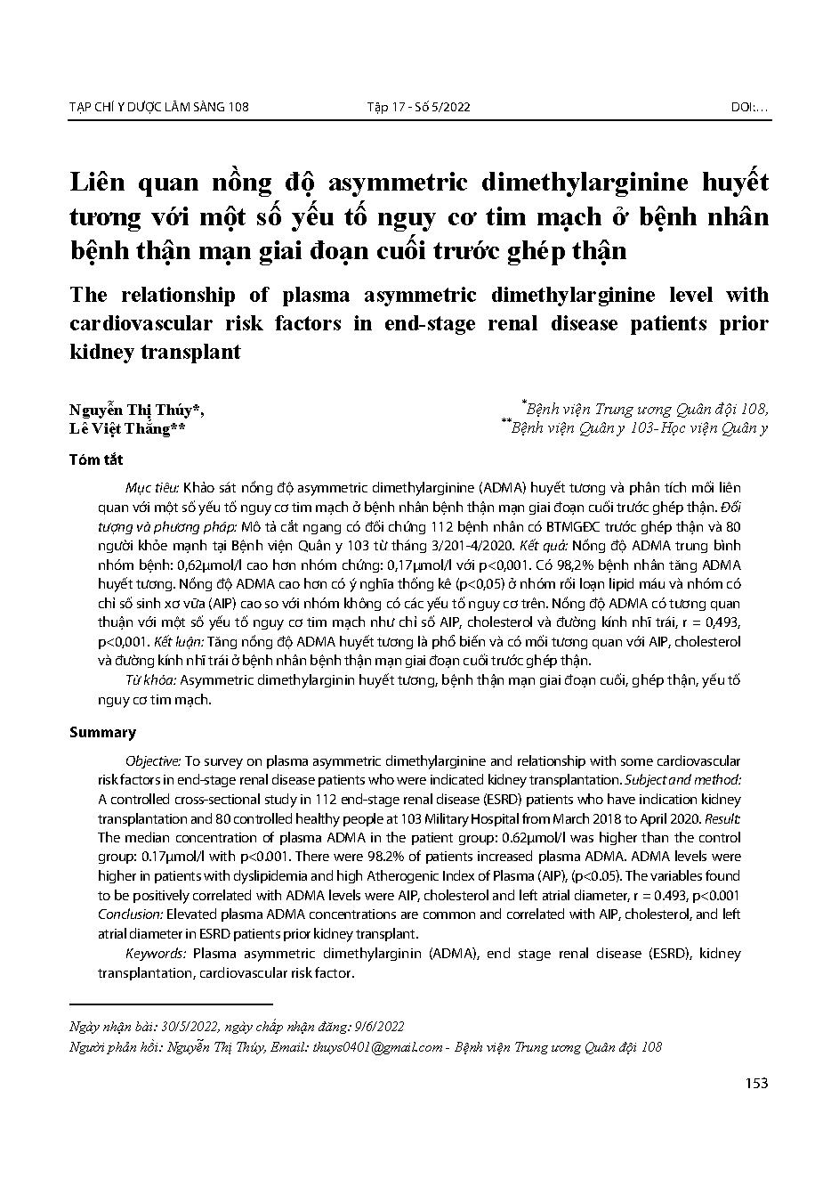 Liên quan nồng độ asymmetric dimethylarginine huyết tương với một số yếu tố nguy cơ tim mạch ở bệnh nhân bệnh thận mạn giai đoạn cuối trước ghép thận = The relationship of plasma asymmetric dimethylarginine level with cardiovascular risk factors in end-st