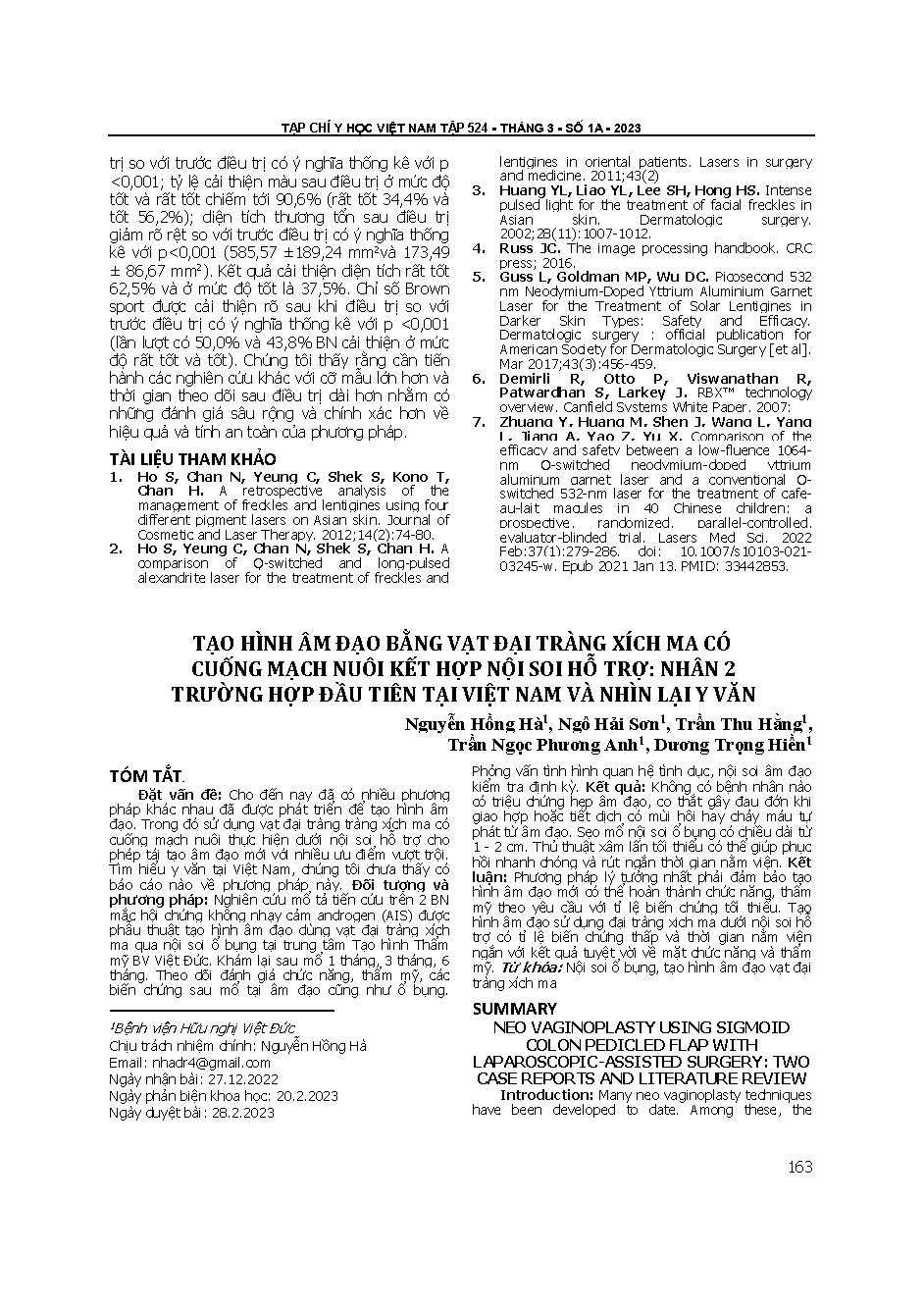 Tạo hình âm đạo bằng vạt đại tràng xích ma có cuống mạch nuôi kết hợp nội soi hỗ trợ: Nhân 2 trường hợp đầu tiên tại Việt Nam và nhìn lại y văn = Neo vaginoplasty using sigmoid colon pedicled flap with laparoscopic-assisted surgery: Two case reports and l