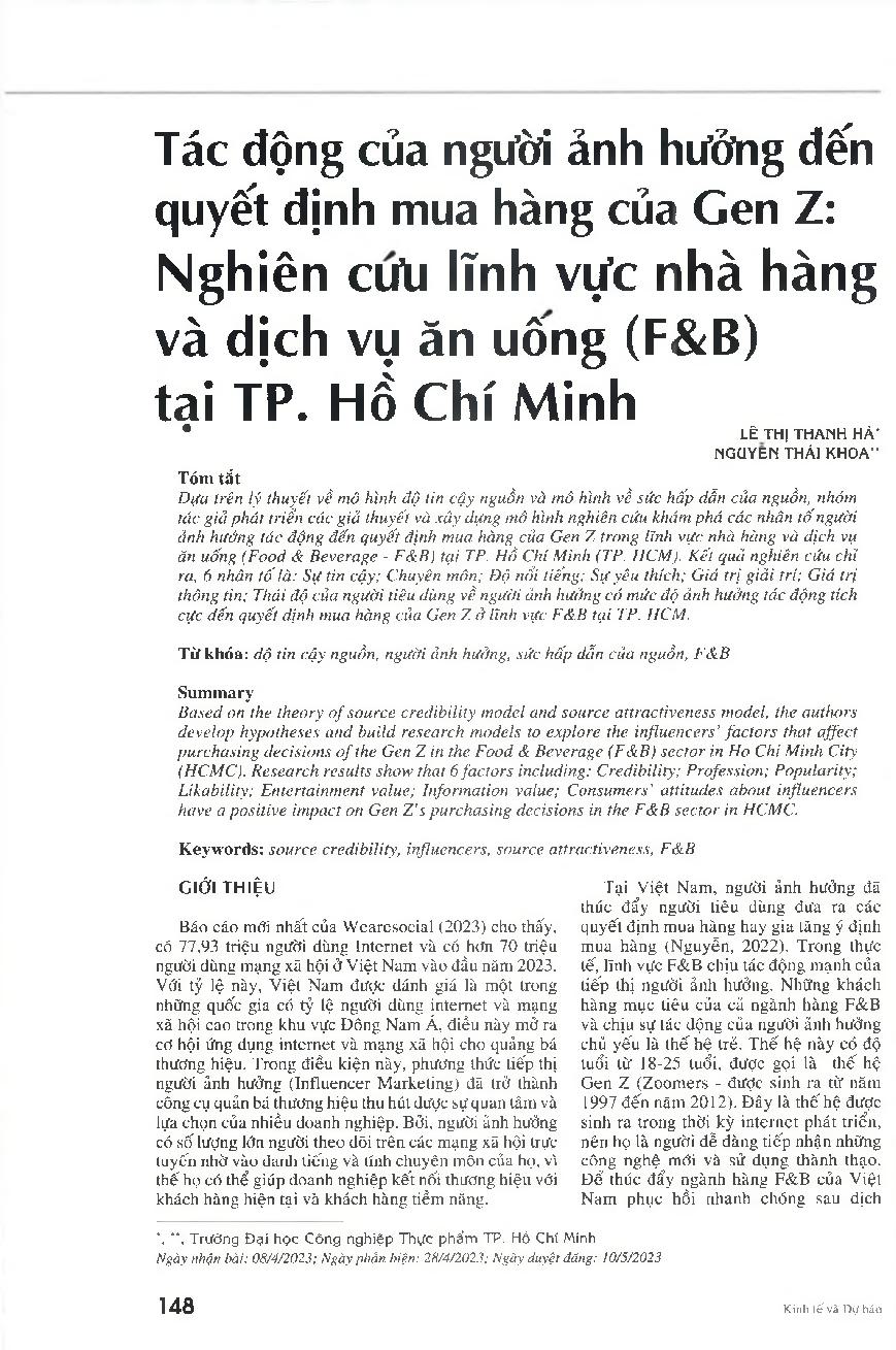 Tác động của người ảnh hưởng đến quyết định mua hàng của Gen Z: Nghiên cứu lĩnh vực nhà hàng và dịch vụ ăn uống (F &B) tại TP. Hồ Chí Minh